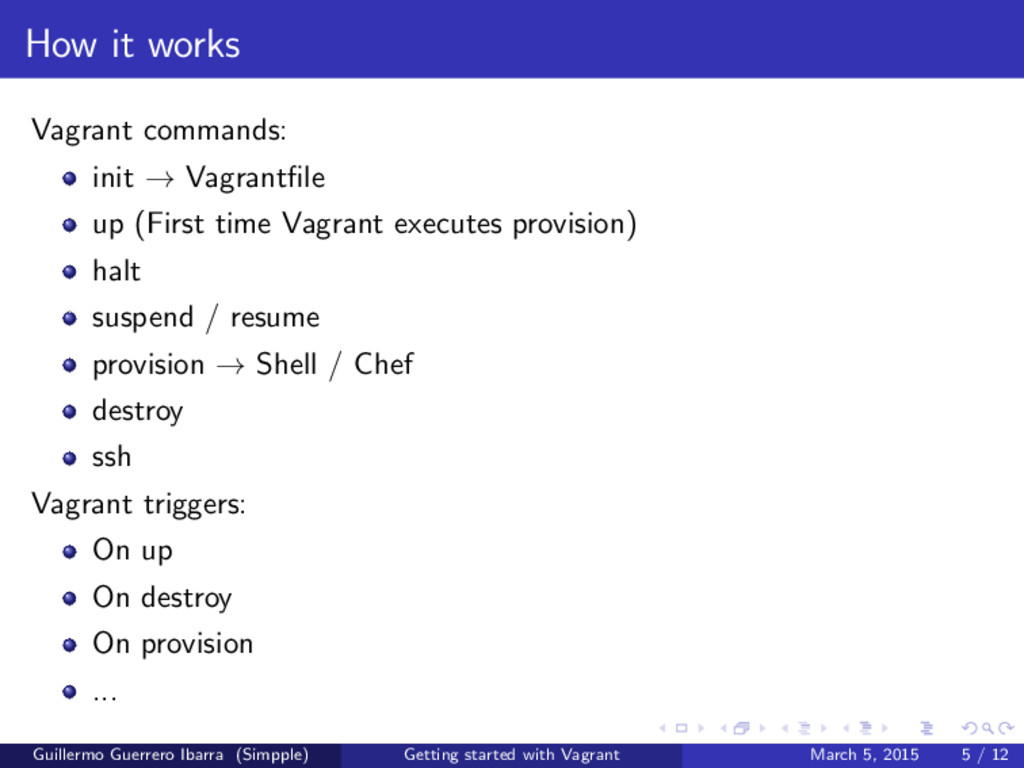 time Vagrant executes provision) halt suspend / resume provision → Shell / Chef destroy ssh Vagrant triggers: On up On destroy On provision ... Guillermo Guerrero Ibarra (Simpple) Getting started with Vagrant March 5, 2015 5 / 12