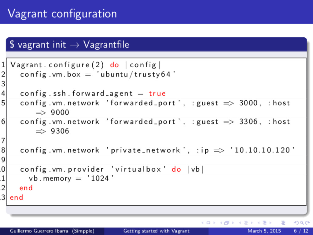 c o n f i g u r e (2) do | c o n f i g | 2 c o n f i g .vm. box = ’ ubuntu/ t r u s t y 6 4 ’ 3 4 c o n f i g . ssh . forward agent = t r u e 5 c o n f i g .vm. network ’ f o rw a r d e d p o rt ’ , : guest => 3000 , : host => 9000 6 c o n f i g .vm. network ’ f o rw a r d e d p o rt ’ , : guest => 3306 , : host => 9306 7 8 c o n f i g .vm. network ’ p r i v a t e n e t w o r k ’ , : i p => ’ 10.10.10.120 ’ 9 10 c o n f i g .vm. p r o v i d e r ’ v i r t u a l b o x ’ do | vb | 11 vb . memory = ’ 1024 ’ 12 end 13 end Guillermo Guerrero Ibarra (Simpple) Getting started with Vagrant March 5, 2015 6 / 12