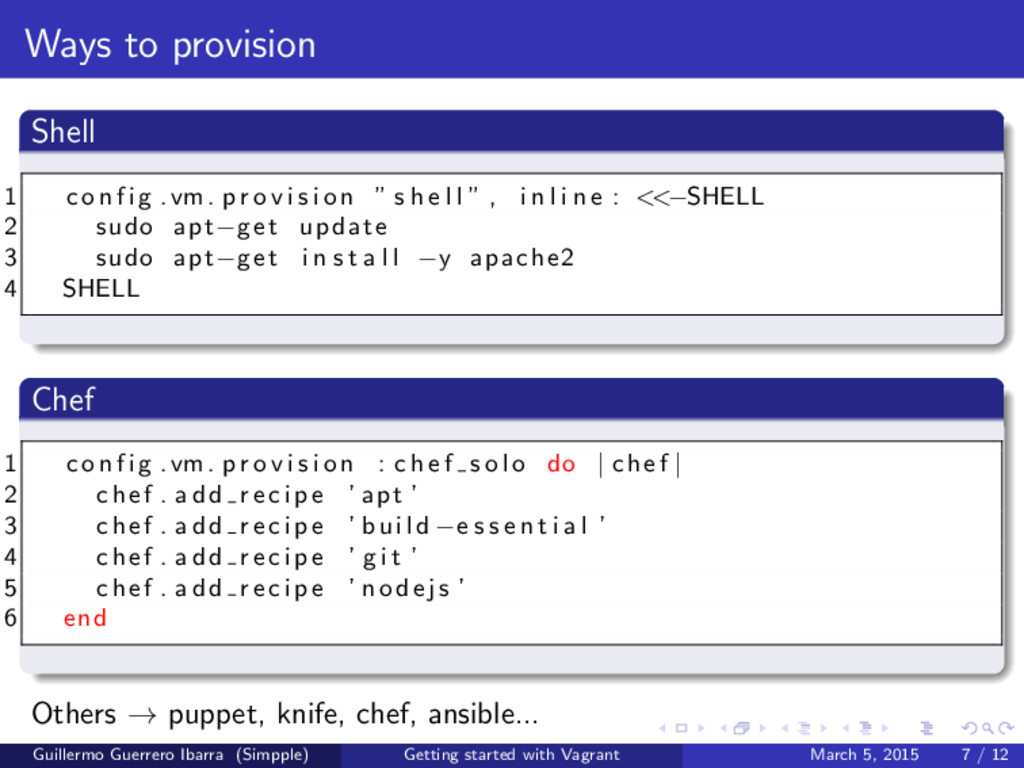 g .vm. p r o v i s i o n ” s h e l l ” , i n l i n e : <<−SHELL 2 sudo apt−get update 3 sudo apt−get i n s t a l l −y apache2 4 SHELL Chef 1 c o n f i g .vm. p r o v i s i o n : c h e f s o l o do | chef | 2 chef . a d d r e c i p e ’ apt ’ 3 chef . a d d r e c i p e ’ build −e s s e n t i a l ’ 4 chef . a d d r e c i p e ’ g i t ’ 5 chef . a d d r e c i p e ’ nodejs ’ 6 end Others → puppet, knife, chef, ansible... Guillermo Guerrero Ibarra (Simpple) Getting started with Vagrant March 5, 2015 7 / 12