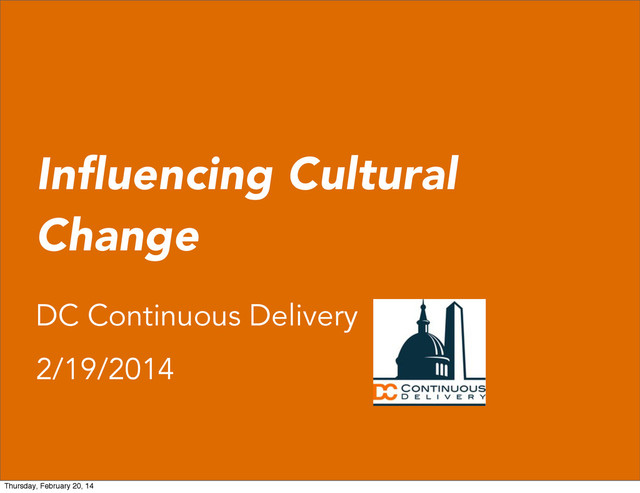 This is the presentation I gave to DC Continuous Deployment on my experiences attempting to make positive cultural changes at a past employer. I share anecdotes on what worked (and didn't) and what lessons I learned.