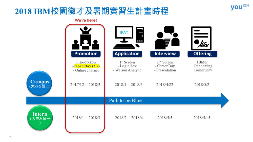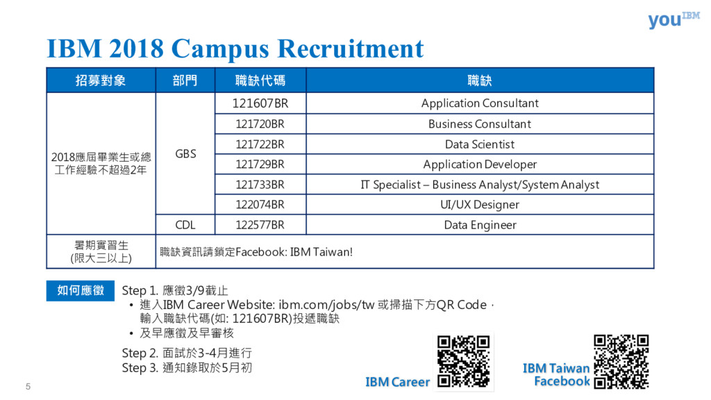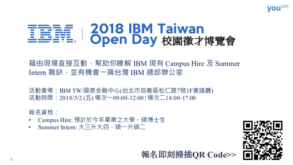 121720BR Business Consultant 121722BR Data Scientist 121729BR Application Developer 121733BR IT Specialist – Business Analyst/System Analyst 122074BR UI/UX Designer CDL 122577BR Data Engineer 暑期實習生 (限大三以上) 職缺資訊請鎖定Facebook: IBM Taiwan! 如何應徵 Step 1. 應徵3/9截止 • 進入IBM Career Website: ibm.com/jobs/tw 或掃描下方QR Code, 輸入職缺代碼(如: 121607BR)投遞職缺 • 及早應徵及早審核 Step 2. 面試於3-4月進行 Step 3. 通知錄取於5月初 IBM Career IBM Taiwan Facebook IBM 2018 Campus Recruitment 5