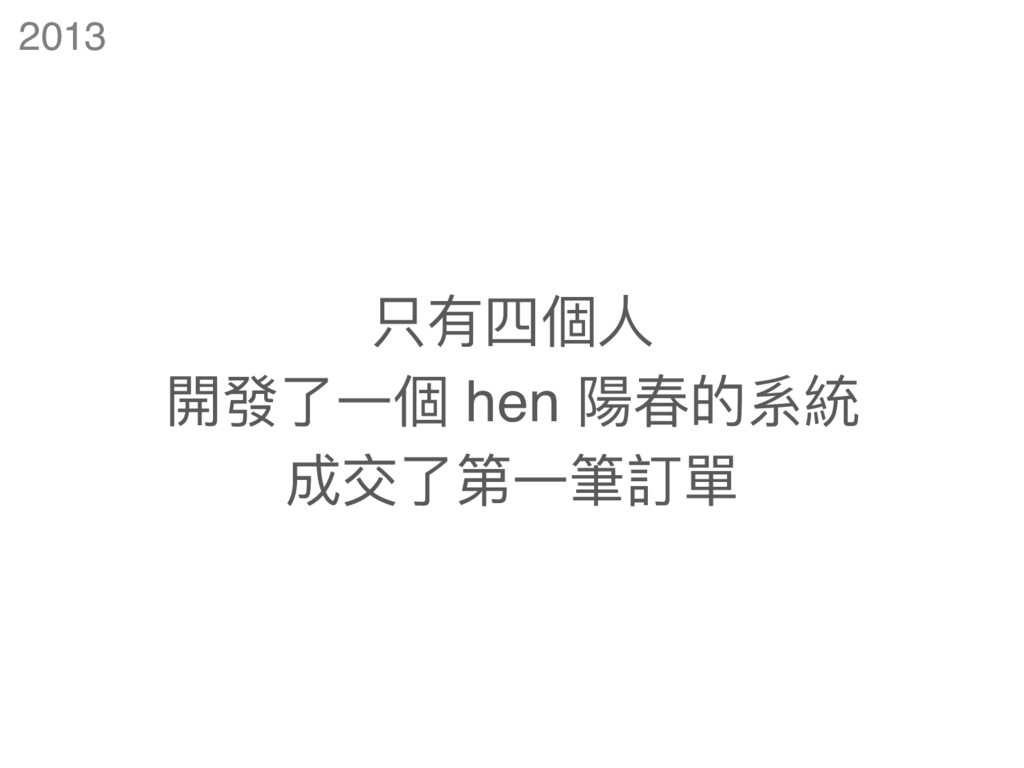 只有四個⼈人 開發了了⼀一個 hen 陽春的系統 成交了了第⼀一筆訂單 2013