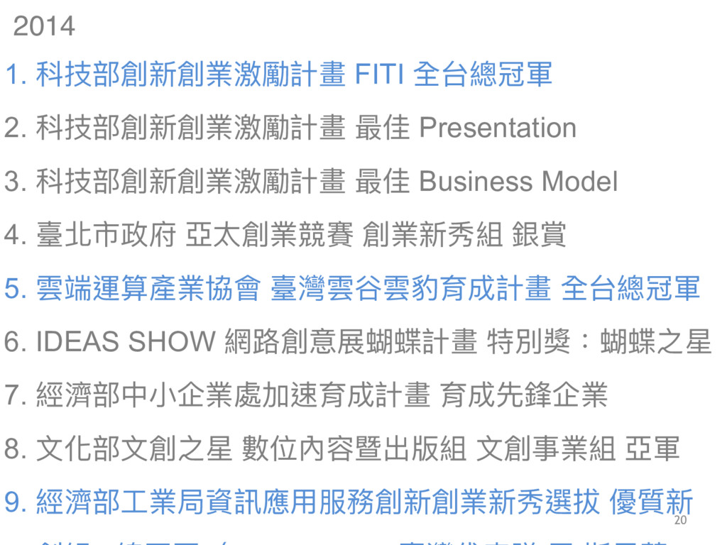 最佳 Business Model 4. 臺北市政府 亞太創業競賽 創業新秀組 銀賞 5. 雲端運算產業協會 臺灣雲⾕谷雲豹育成計畫 全台總冠軍 6. IDEAS SHOW 網路路創意展蝴蝶計畫 特別獎:蝴蝶之星 7. 經濟部中⼩小企業處加速育成計畫 育成先鋒企業 8. ⽂文化部⽂文創之星 數位內容暨出版組 ⽂文創事業組 亞軍 9. 經濟部⼯工業局資訊應⽤用服務創新創業新秀選拔 優質新 20 2014