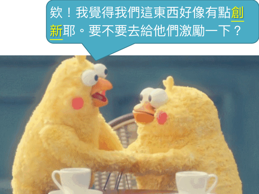 欸!我覺得我們這東⻄西好像有點創 新耶。要不要去給他們激勵⼀一下?