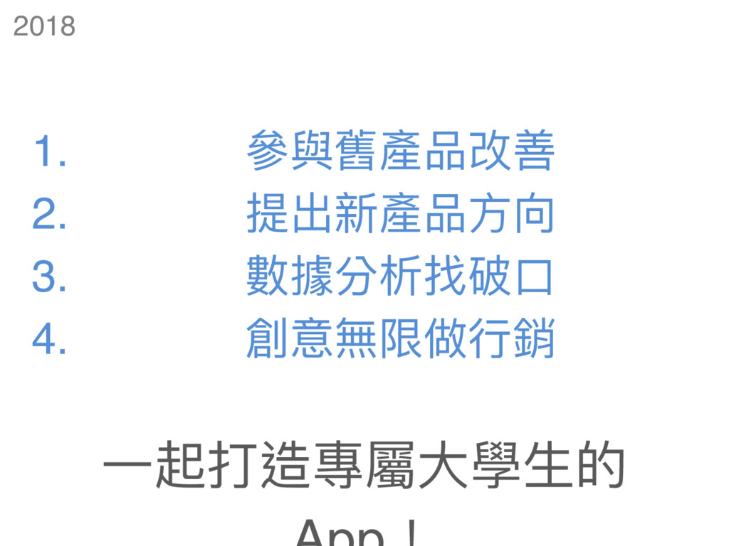 1. 參參與舊產品改善 2. 提出新產品⽅方向 3. 數據分析找破⼝口 4. 創意無限做⾏行行銷 ⼀一起打造專屬⼤大學⽣生的 2018