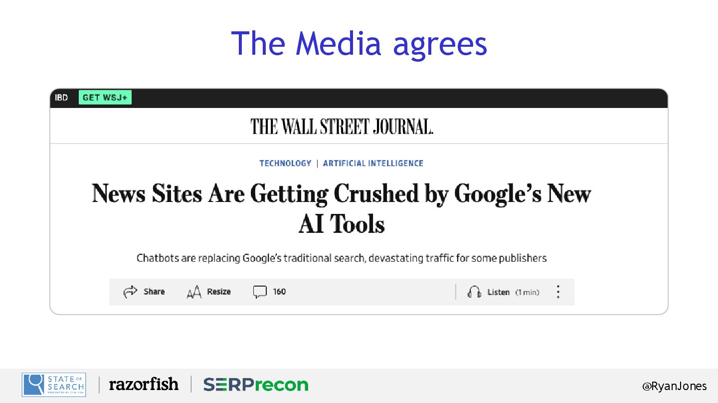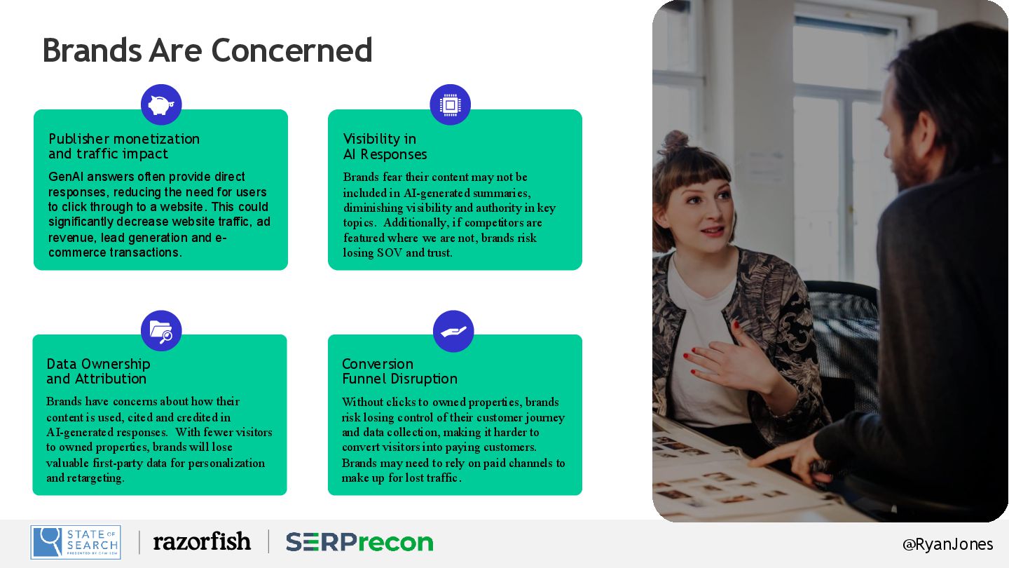 direct responses, reducing the need for users to click through to a website. This could significantly decrease website traffic, ad revenue, lead generation and e- commerce transactions. Visibility in AI Responses Brands fear their content may not be included in AI-generated summaries, diminishing visibility and authority in key topics. Additionally, if competitors are featured where we are not, brands risk losing SOV and trust. Data Ownership and Attribution Brands have concerns about how their content is used, cited and credited in AI-generated responses. With fewer visitors to owned properties, brands will lose valuable first-party data for personalization and retargeting. Conversion Funnel Disruption Without clicks to owned properties, brands risk losing control of their customer journey and data collection, making it harder to convert visitors into paying customers. Brands may need to rely on paid channels to make up for lost traffic. Brands Are Concerned