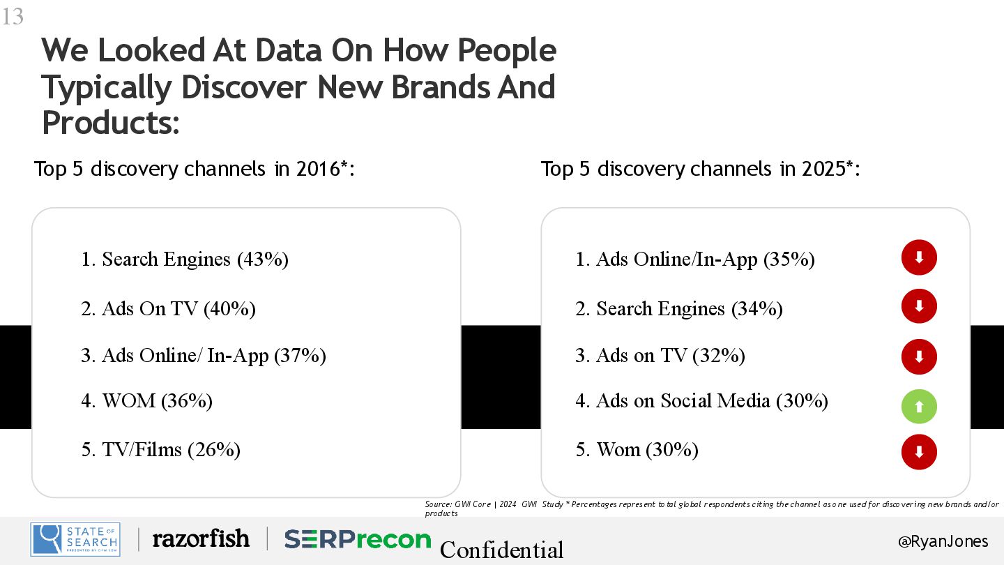 New Brands And Products: Confidential 13 1. Search Engines (43%) Top 5 discovery channels in 2016*: Top 5 discovery channels in 2025*: 2. Ads On TV (40%) 5. TV/Films (26%) 3. Ads Online/ In-App (37%) 4. WOM (36%) 1. Ads Online/In-App (35%) 2. Search Engines (34%) 5. Wom (30%) 3. Ads on TV (32%) 4. Ads on Social Media (30%) Source: GWI Core | 2024 GWI Study * Percentages represent total global respondents citing the channel as one used for discovering new brands and/or products