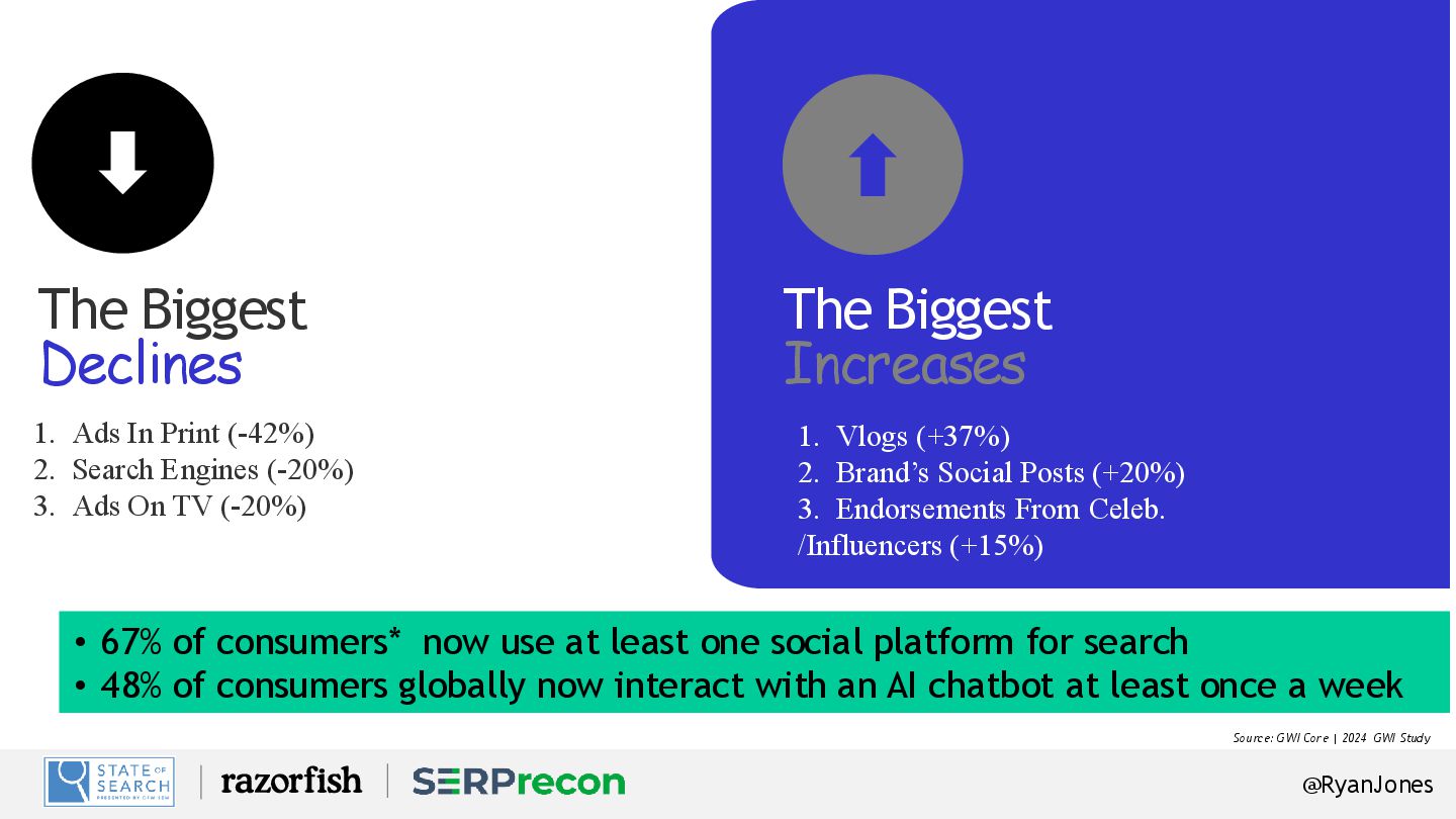 2. Search Engines (-20%) 3. Ads On TV (-20%) The Biggest Increases 1. Vlogs (+37%) 2. Brand’s Social Posts (+20%) 3. Endorsements From Celeb. /Influencers (+15%) Source: GWI Core | 2024 GWI Study • 67% of consumers* now use at least one social platform for search • 48% of consumers globally now interact with an AI chatbot at least once a week
