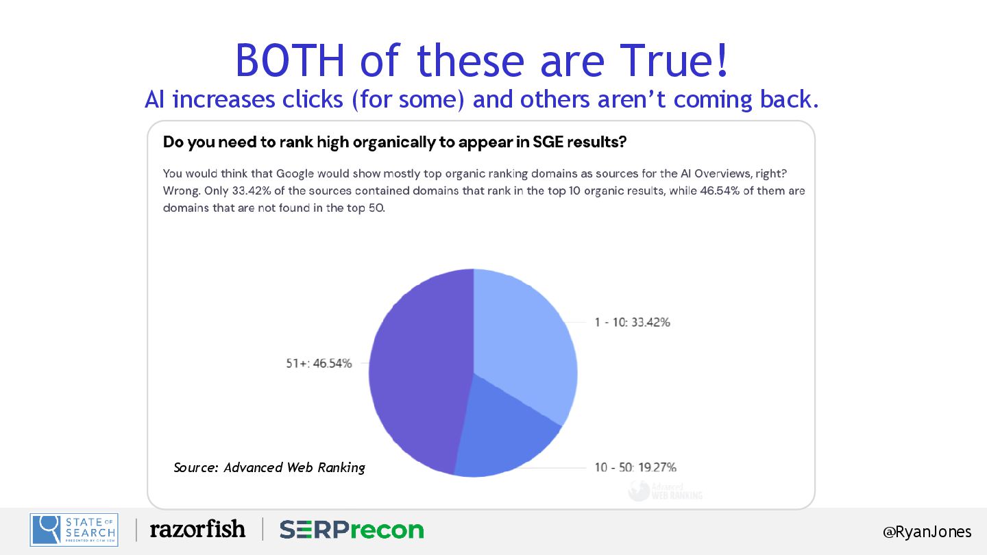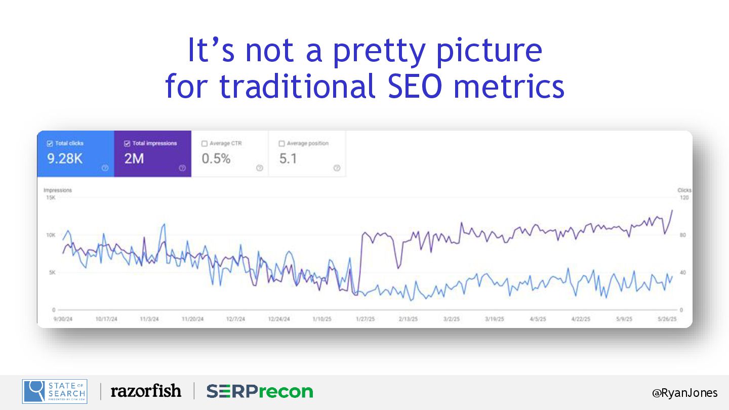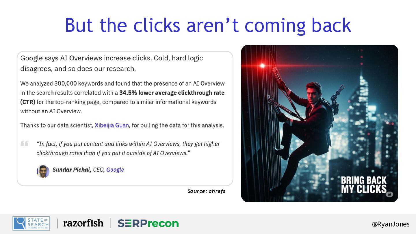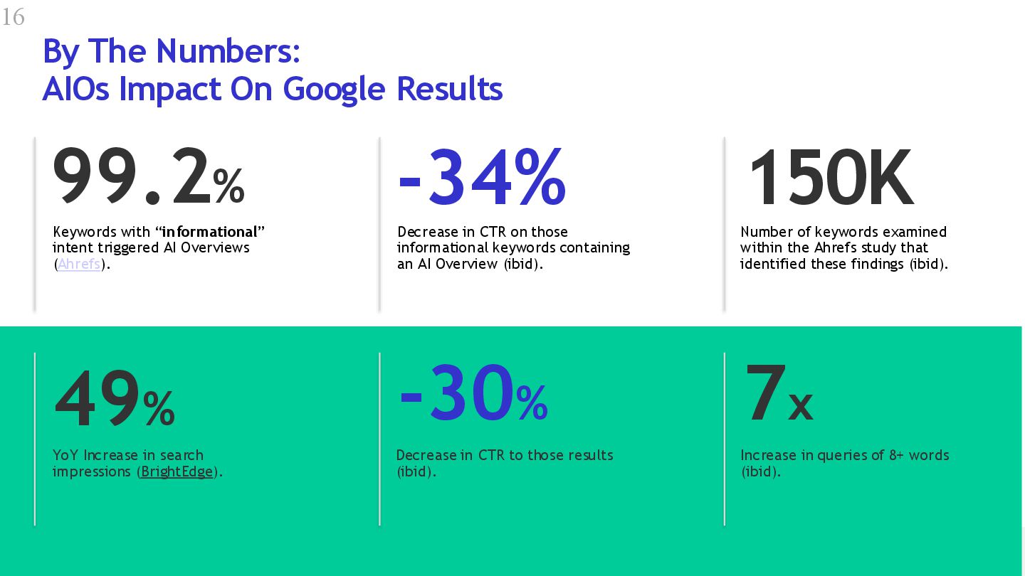 Keywords with “informational” intent triggered AI Overviews (Ahrefs). Decrease in CTR on those informational keywords containing an AI Overview (ibid). Number of keywords examined within the Ahrefs study that identified these findings (ibid). YoY Increase in search impressions (BrightEdge). Decrease in CTR to those results (ibid). Increase in queries of 8+ words (ibid). 49% 7x 99.2% -30% -34% 150K