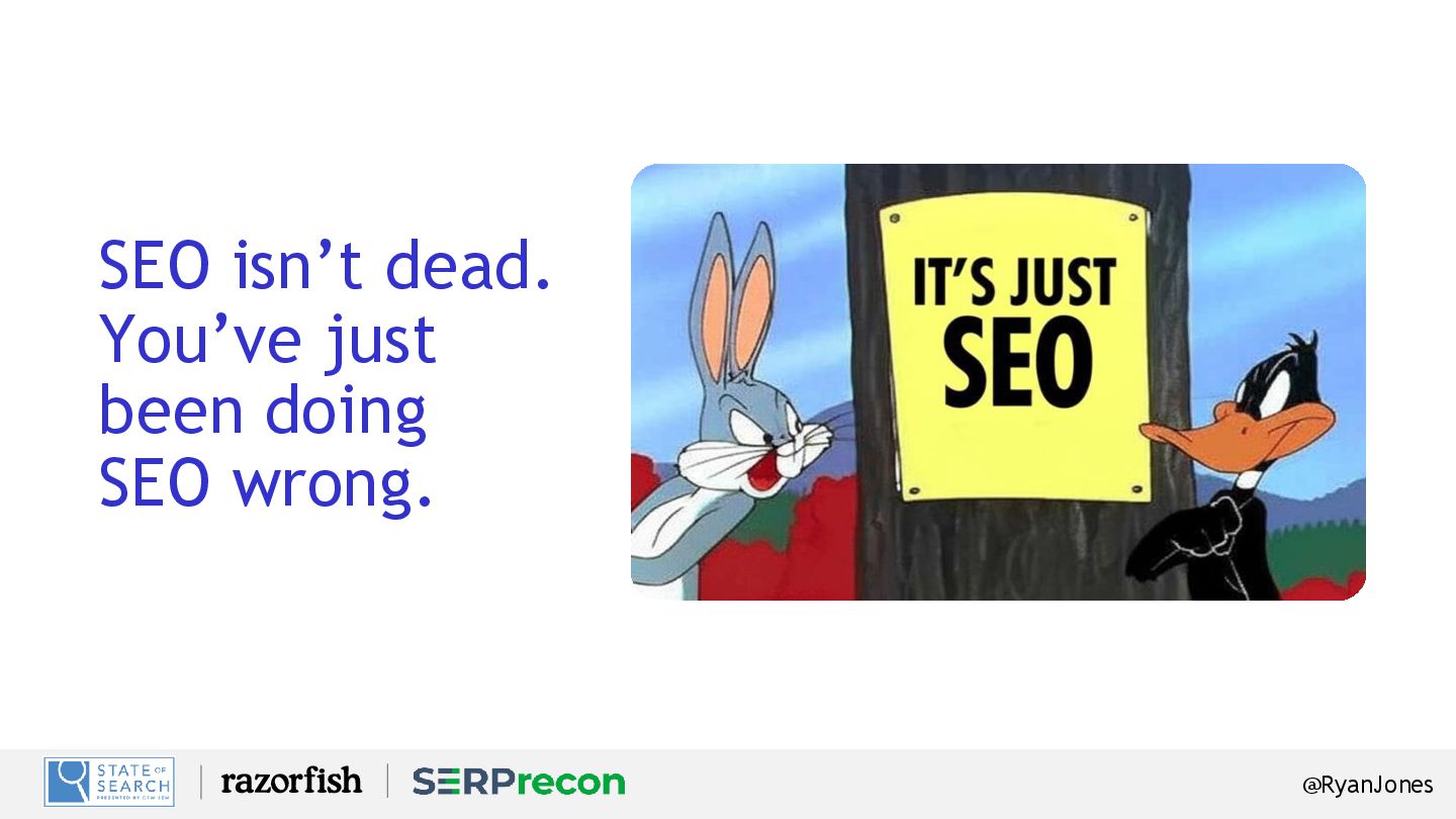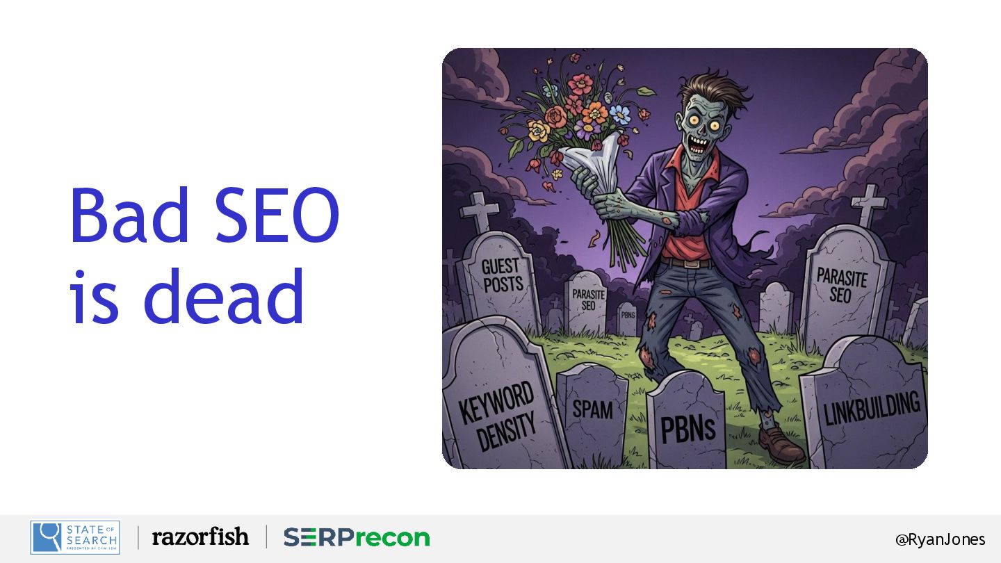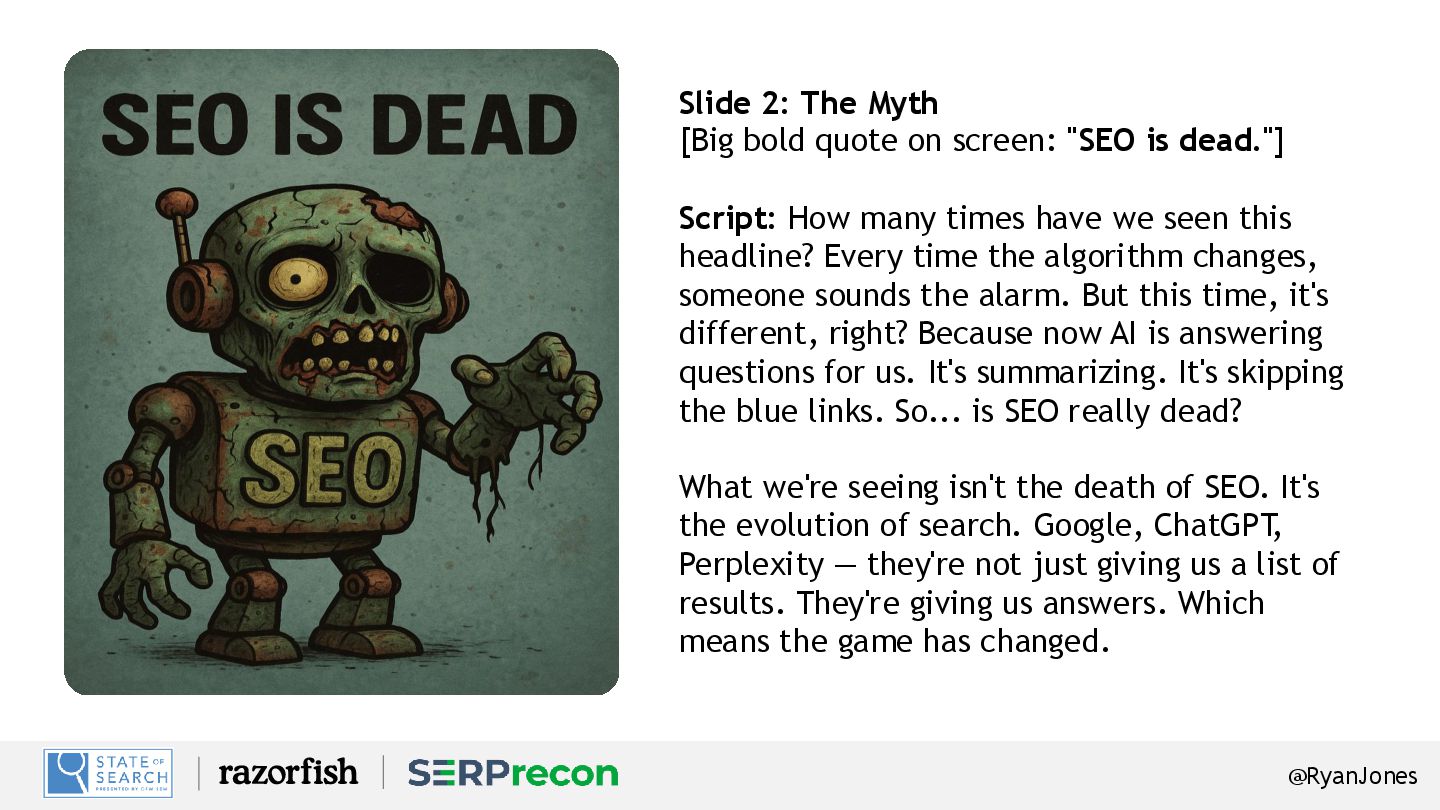 "SEO is dead."] Script: How many times have we seen this headline? Every time the algorithm changes, someone sounds the alarm. But this time, it's different, right? Because now AI is answering questions for us. It's summarizing. It's skipping the blue links. So... is SEO really dead? What we're seeing isn't the death of SEO. It's the evolution of search. Google, ChatGPT , Perplexity — they're not just giving us a list of results. They're giving us answers. Which means the game has changed.