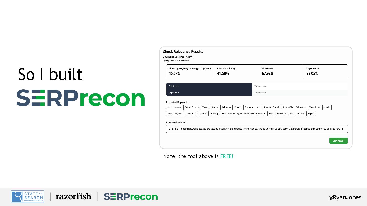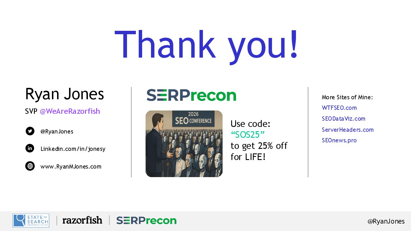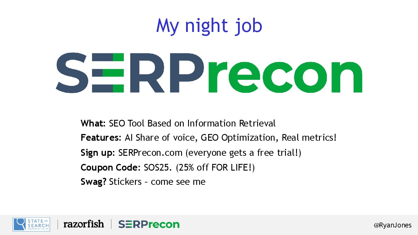 Retrieval Features: AI Share of voice, GEO Optimization, Real metrics! Sign up: SERPrecon.com (everyone gets a free trial!) Coupon Code: SOS25. (25% off FOR LIFE!) Swag? Stickers – come see me