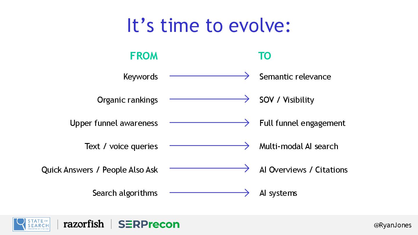 SOV / Visibility Keywords Organic rankings Upper funnel awareness FROM Multi-modal AI search AI Overviews / Citations Quick Answers / People Also Ask TO AI systems Search algorithms Text / voice queries