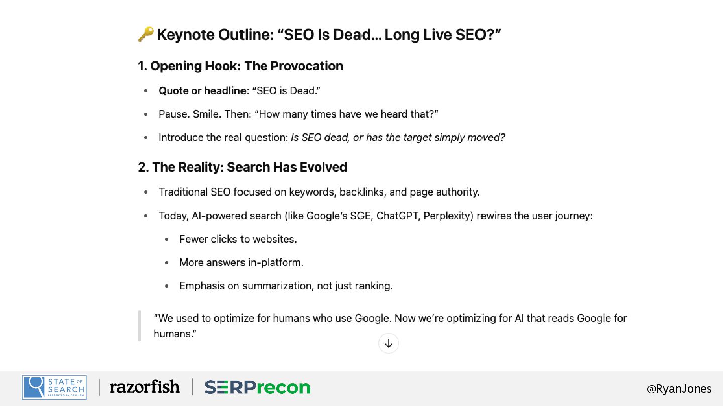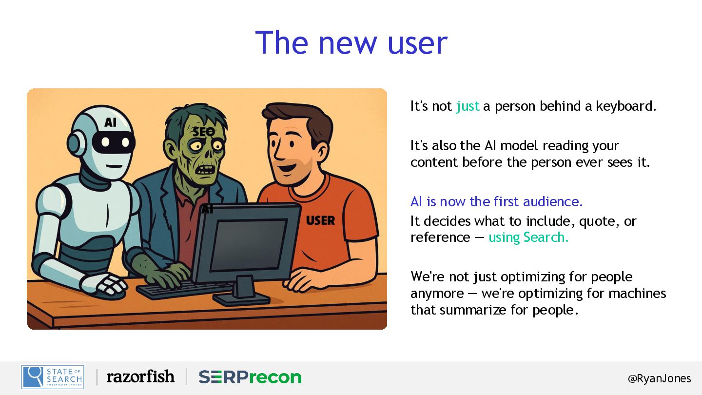 a keyboard. It's also the AI model reading your content before the person ever sees it. AI is now the first audience. It decides what to include, quote, or reference — using Search. We're not just optimizing for people anymore — we're optimizing for machines that summarize for people.
