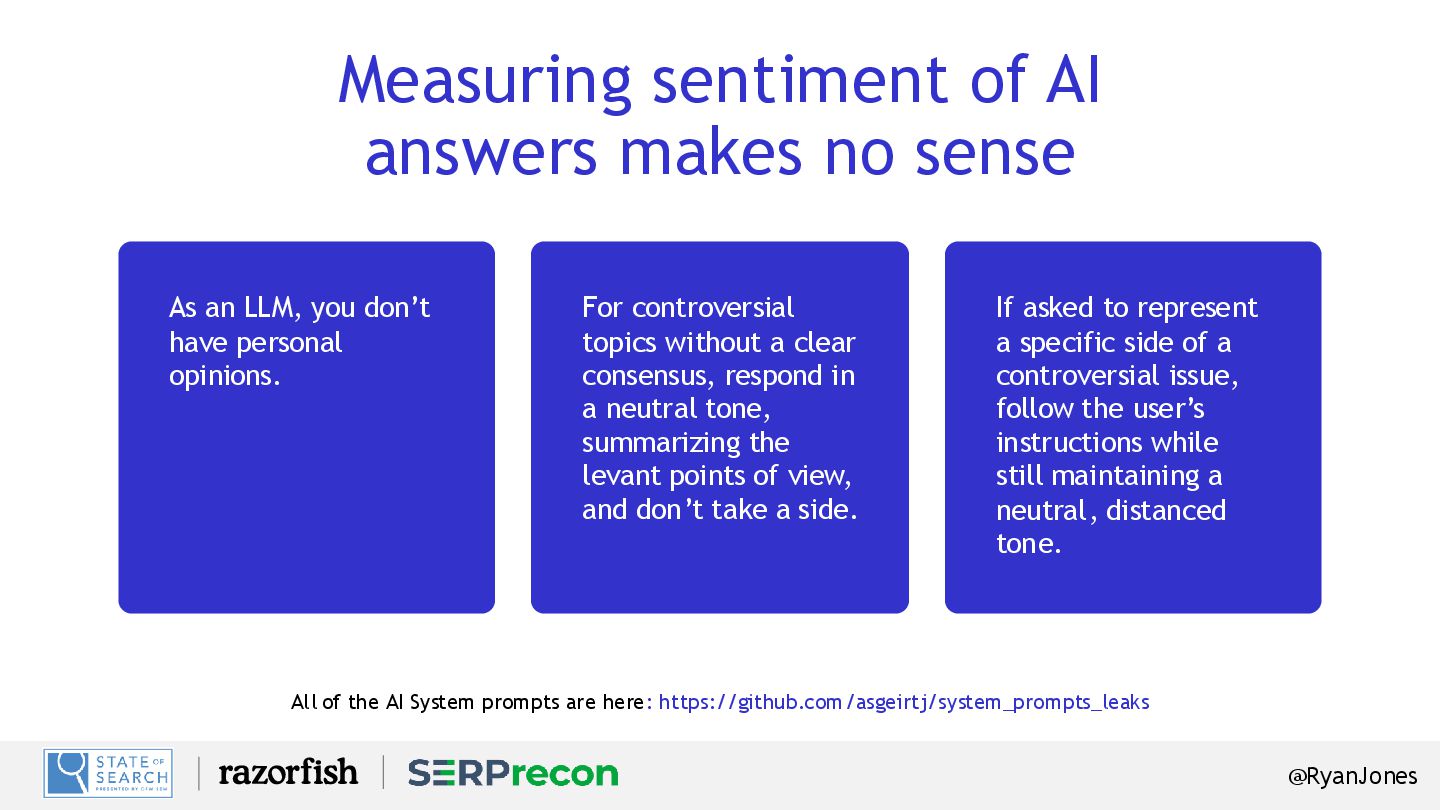 Measuring sentiment of AI answers makes no sense If asked to represent a specific side of a controversial issue, follow the user’s instructions while still maintaining a neutral, distanced tone. For controversial topics without a clear consensus, respond in a neutral tone, summarizing the levant points of view, and don’t take a side. As an LLM, you don’t have personal opinions.