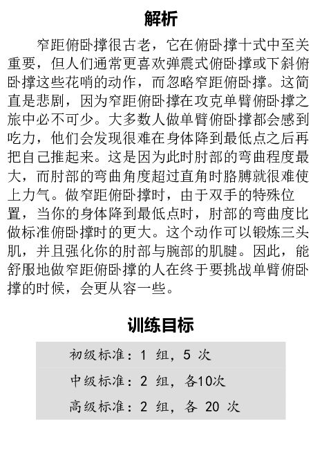 解析 窄距深蹲具有标准深蹲的所有益处,但是对 股四头肌的影响更大。经常练习该动作真的能强 化你的膝盖、胫骨和臀部肌肉,让你的臀部更紧 实,效果比任何一种器械训练都好。 训练目标 初级标准:1 组,5 次 中级标准:2