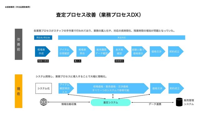 ࡞ ΞΠςϜ ࢹ֬ೝ ૬ද র߹ ൢചཤྺ σʔλ֬ೝ ָఱ ֬ೝ ܦݧͱצͰ Ձ֨ఏࣔ Ձ֨ަব ܖཱ ܖཱ Ձ֨ަব ૬Ձ֨ɾൢചՁ֨ɾަবՁ֨ ͯ͢ҰͭͷγεςϜͰࢀরՄೳ ΞΠςϜ ֬ೝ߲ ೖྗ γεςϜԽ ۀͷݪҼ ࠪఆγεςϜ ใࣗಈऩू ൢചཧ γεςϜ σʔλ࿈ܞ ֤ۀϓϩηε͕ελοϑͷख࡞ۀͰߦΘΕ͓ͯΓɺۀͷଐਓԽɺରԠͷ࣌ؒԽɺۀ࣌ؒͷ૿Ճ͕ͱͳ͍ͬͯͨɻ γεςϜ։ൃ͠ɺۀϓϩηεʹಋೖ͢Δ͜ͱͰେ෯ʹ؆ུԽɻ ଐਓԽ ࣌ؒԽ