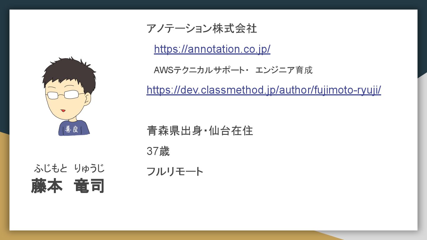 ふじもと りゅうじ 藤本 竜司 アノテーション株式会社 https://annotation.co.jp/ AWSテクニカルサポート・ エンジニア育成 https://dev.classmethod.jp/author/fujimoto-ryuji/ 青森県出身・仙台在住 37歳 フルリモート