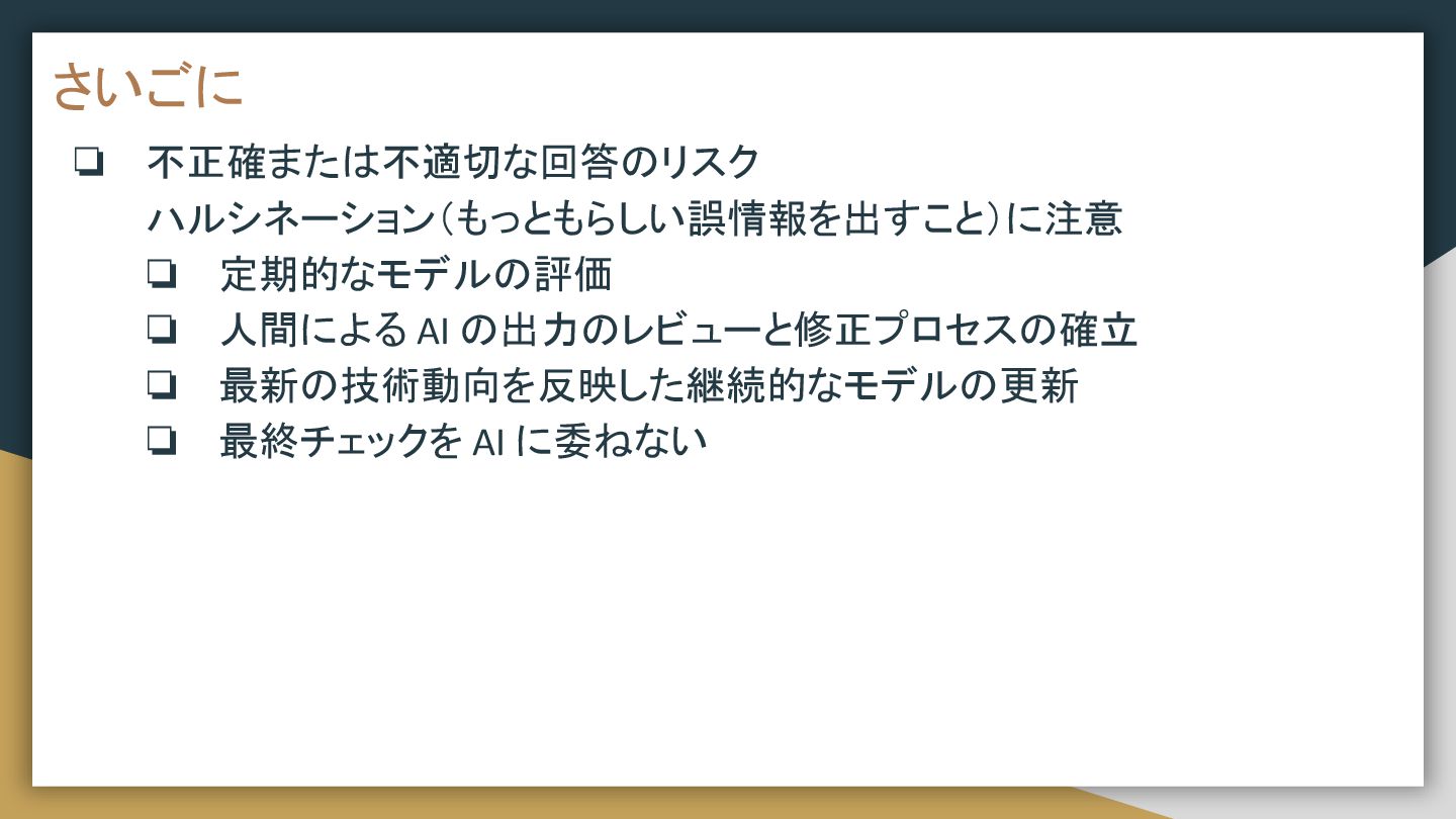 さいごに ❏ 不正確または不適切な回答のリスク ハルシネーション(もっともらしい誤情報を出すこと)に注意 ❏ 定期的なモデルの評価 ❏ 人間による AI の出力のレビューと修正プロセスの確立