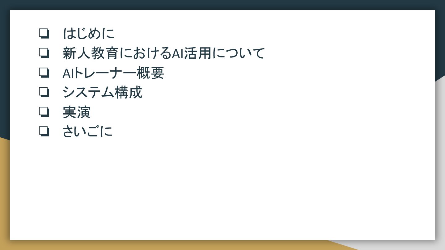 ❏ はじめに ❏ 新人教育におけるAI活用について ❏ AIトレーナー概要 ❏ システム構成 ❏ 実演