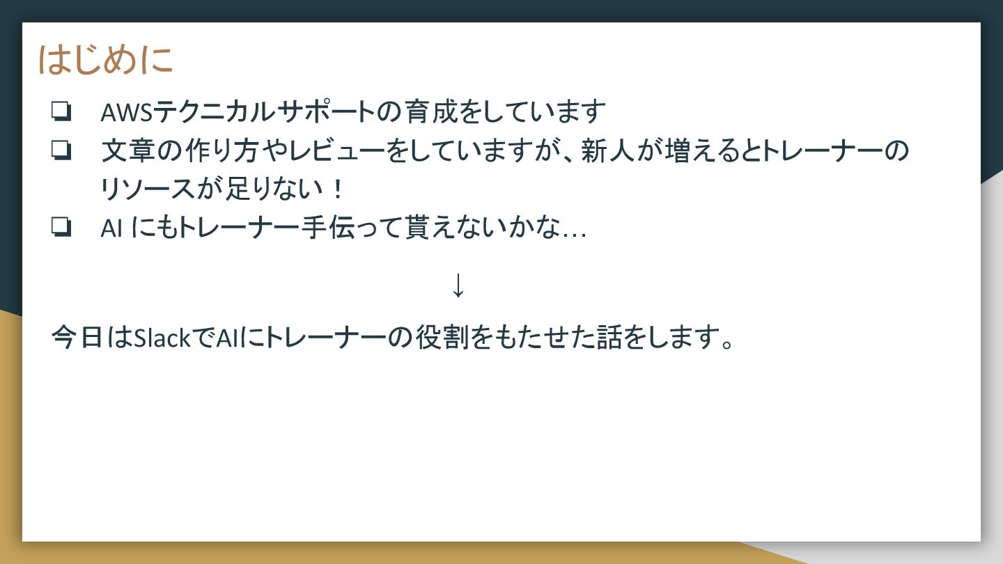 はじめに ❏ AWSテクニカルサポートの育成をしています ❏ 文章の作り方やレビューをしていますが、新人が増えるとトレーナーの リソースが足りない! ❏ AI にもトレーナー手伝って貰えないかな… ↓