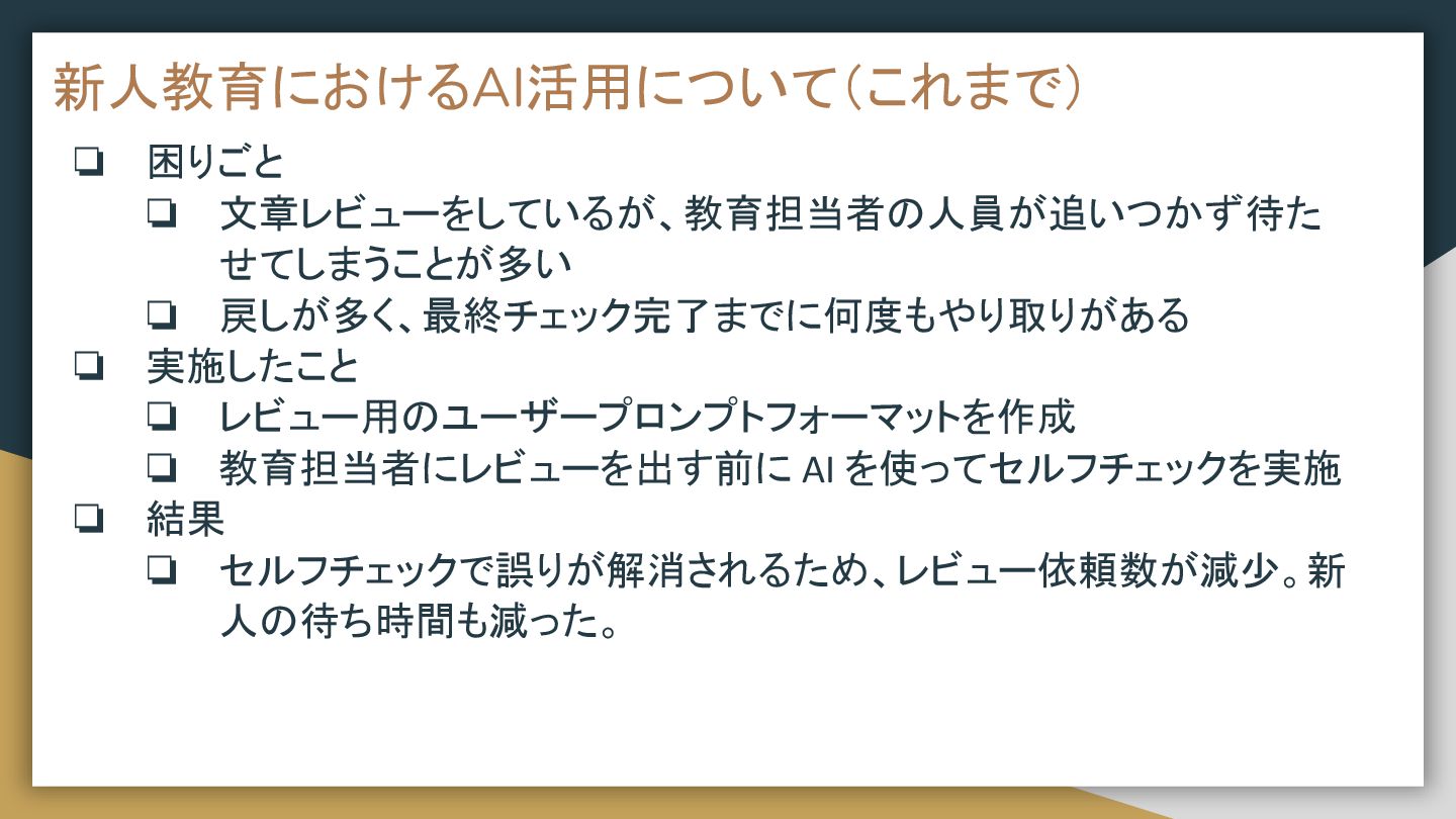 ❏ レビュー用のユーザープロンプトフォーマットを作成 ❏ 教育担当者にレビューを出す前に AI を使ってセルフチェックを実施 ❏ 結果 ❏ セルフチェックで誤りが解消されるため、レビュー依頼数が減少。新 人の待ち時間も減った。