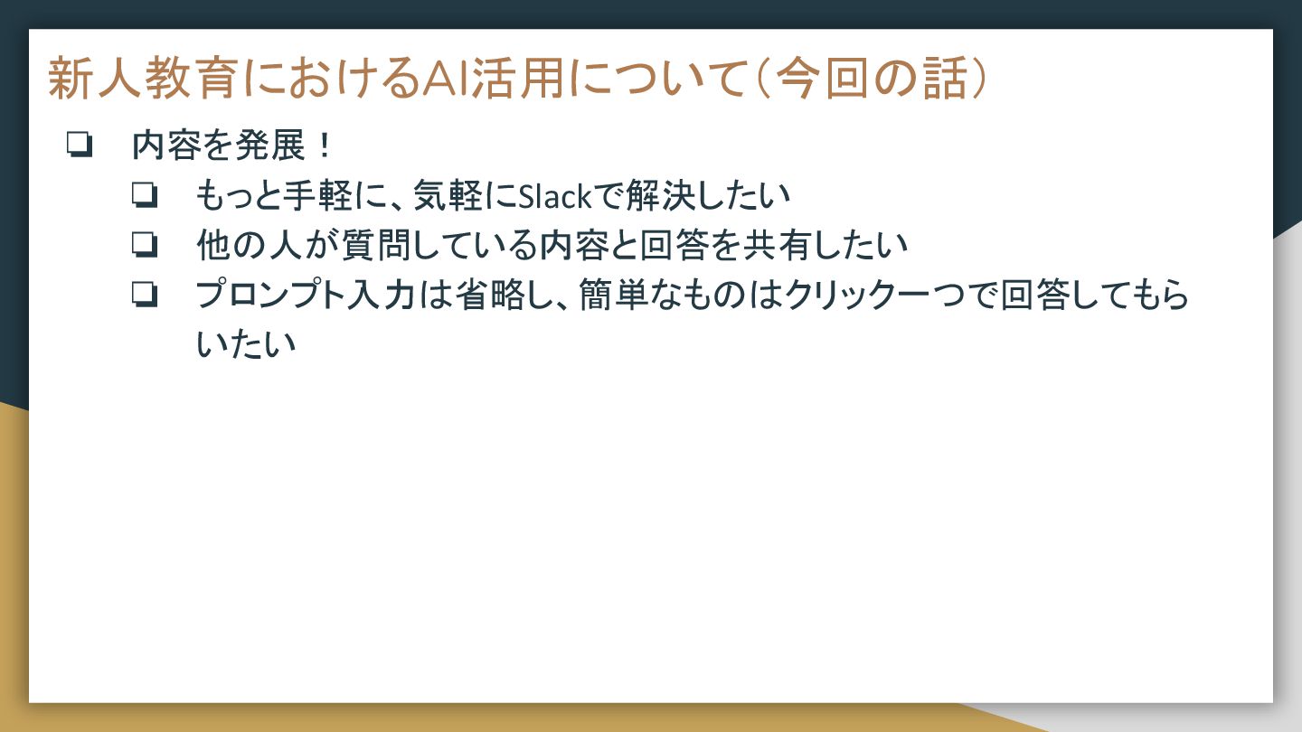 新人教育におけるAI活用について(今回の話) ❏ 内容を発展! ❏ もっと手軽に、気軽にSlackで解決したい ❏ 他の人が質問している内容と回答を共有したい ❏ プロンプト入力は省略し、簡単なものはクリック一つで回答してもら いたい