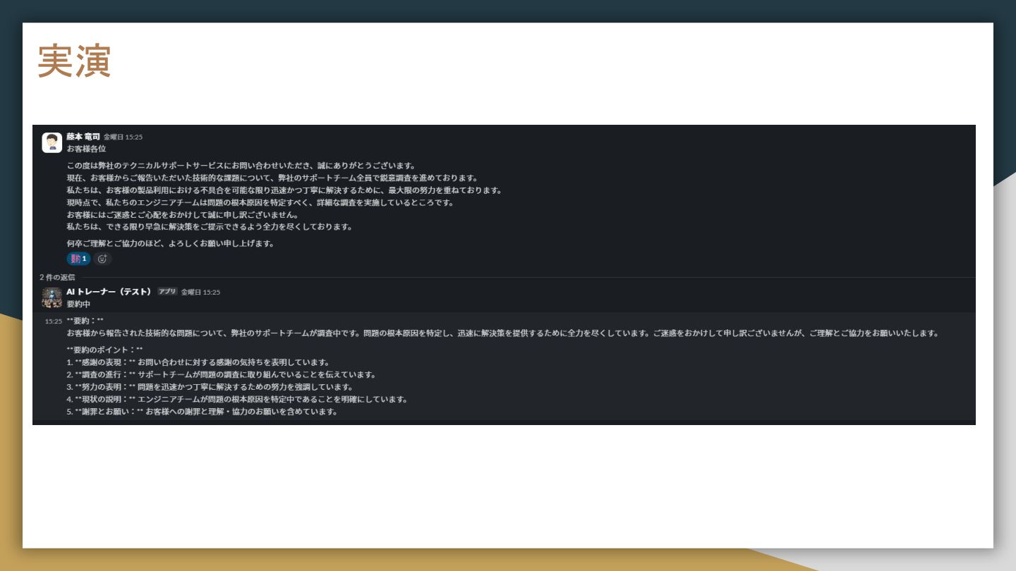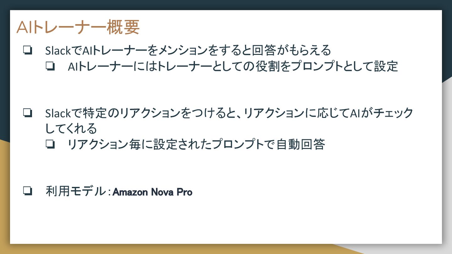 今日はSlackでAIにトレーナーの役割をもたせた話をします。