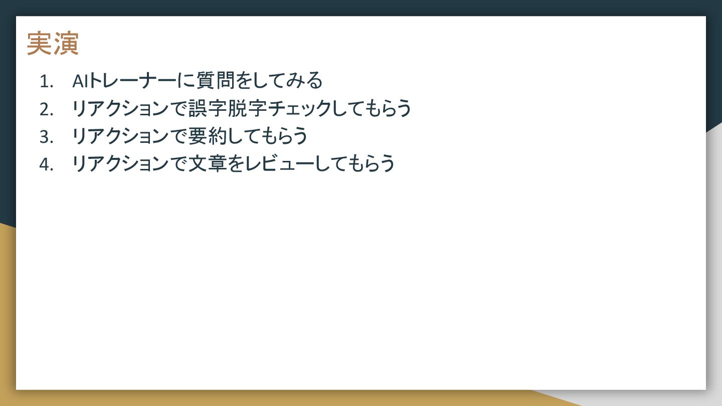 実演 1. AIトレーナーに質問をしてみる 2. リアクションで誤字脱字チェックしてもらう 3. リアクションで要約してもらう 4. リアクションで文章をレビューしてもらう