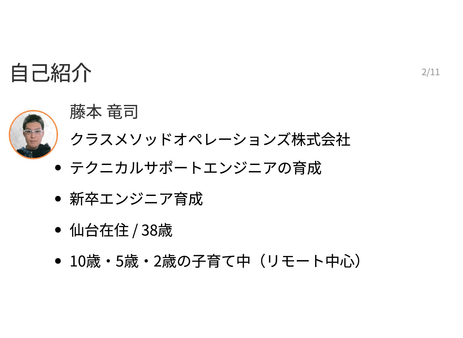 自己紹介 藤本 竜司 クラスメソッドオペレーションズ株式会社 テクニカルサポートエンジニアの育成 新卒エンジニア育成 仙台在住 / 38歳 10歳・5歳・2歳の子育て中(リモート中心)