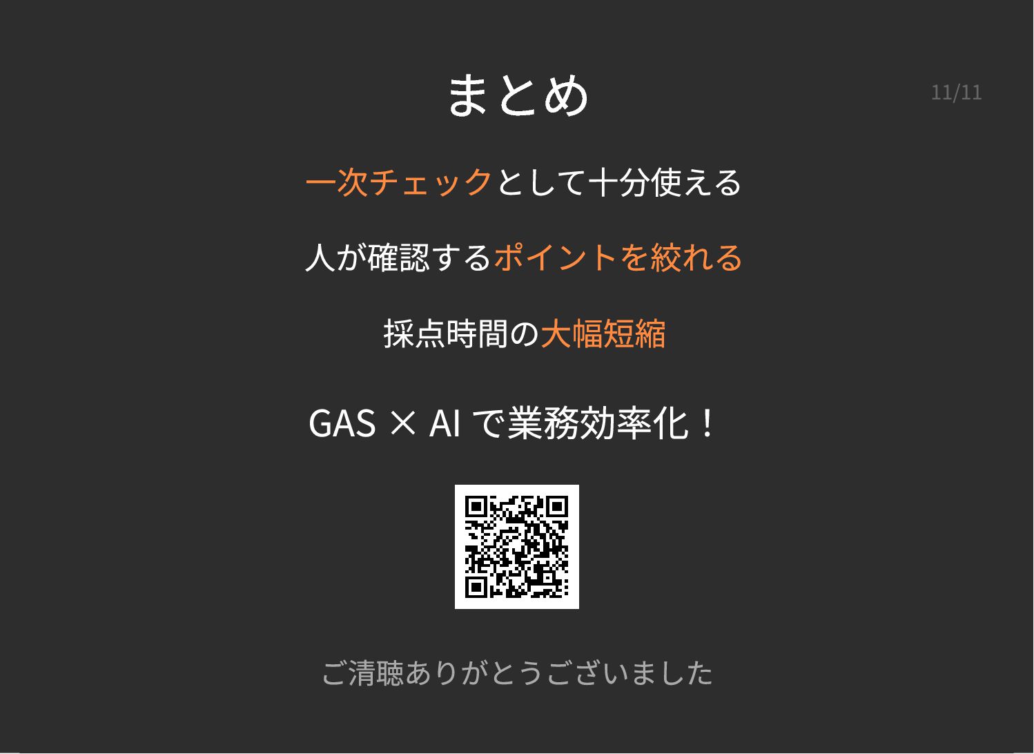 まとめ 一次チェックとして十分使える 人が確認するポイントを絞れる 採点時間の大幅短縮 GAS × AI で業務効率化! ご清聴ありがとうございました 11/11