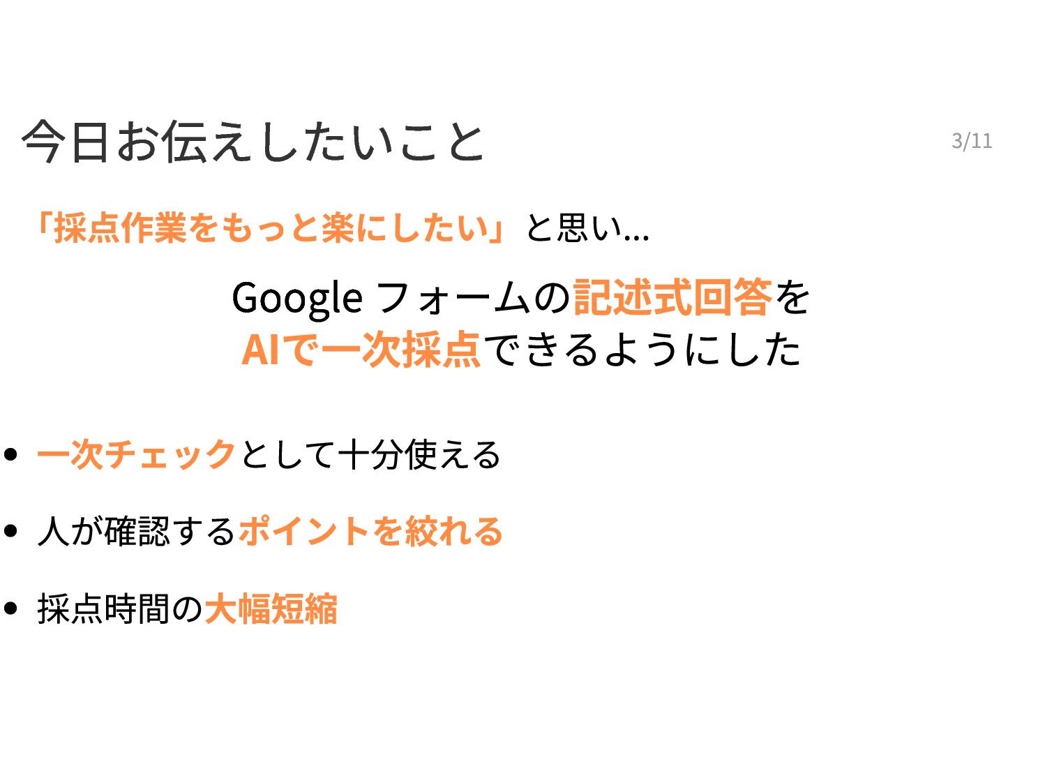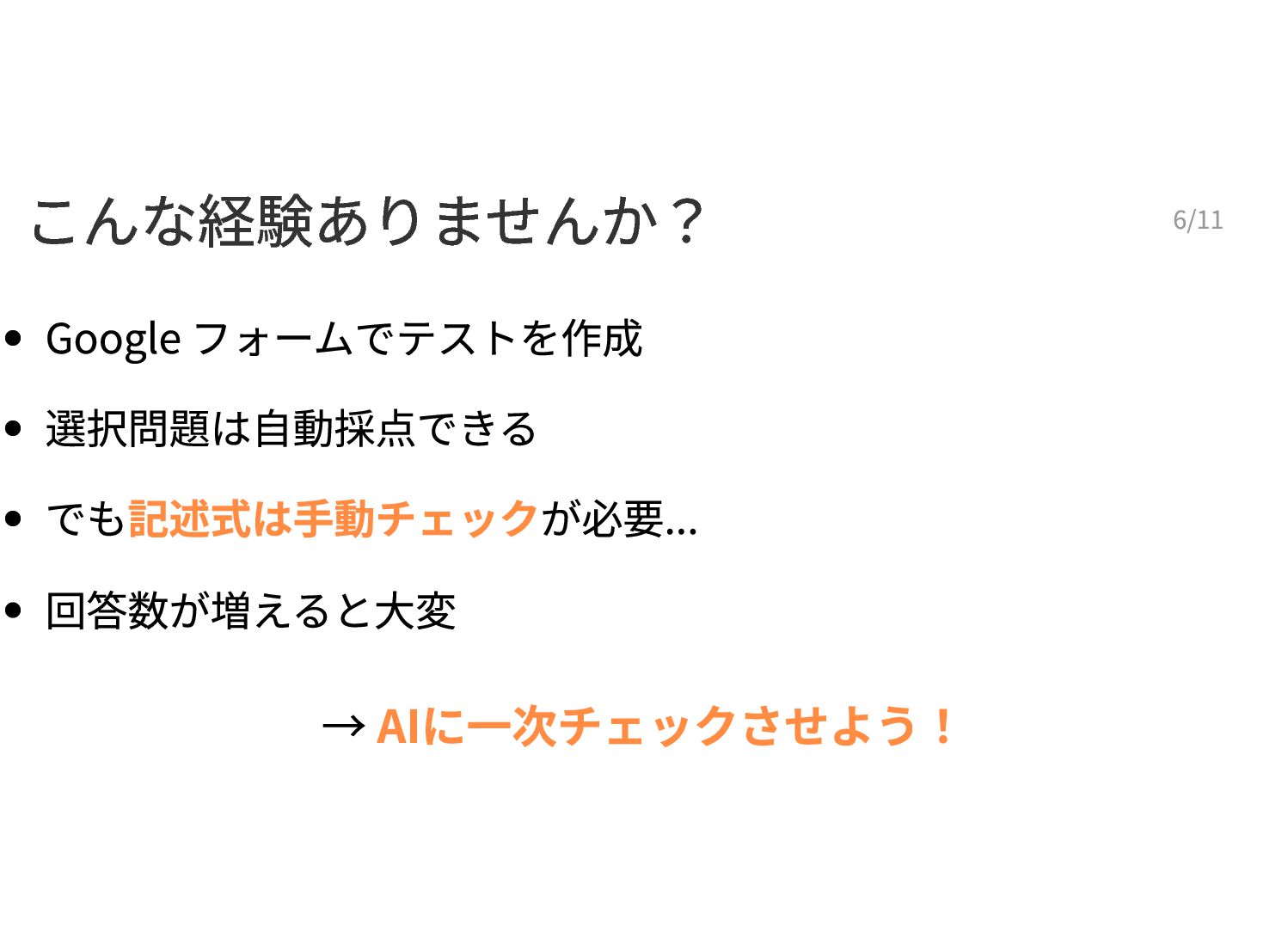 今日お伝えしたいこと 「採点作業をもっと楽にしたい」と思い... Google フォームの記述式回答を AIで一次採点できるようにした 一次チェックとして十分使える 人が確認するポイントを絞れる 採点時間の大幅短縮 3/11