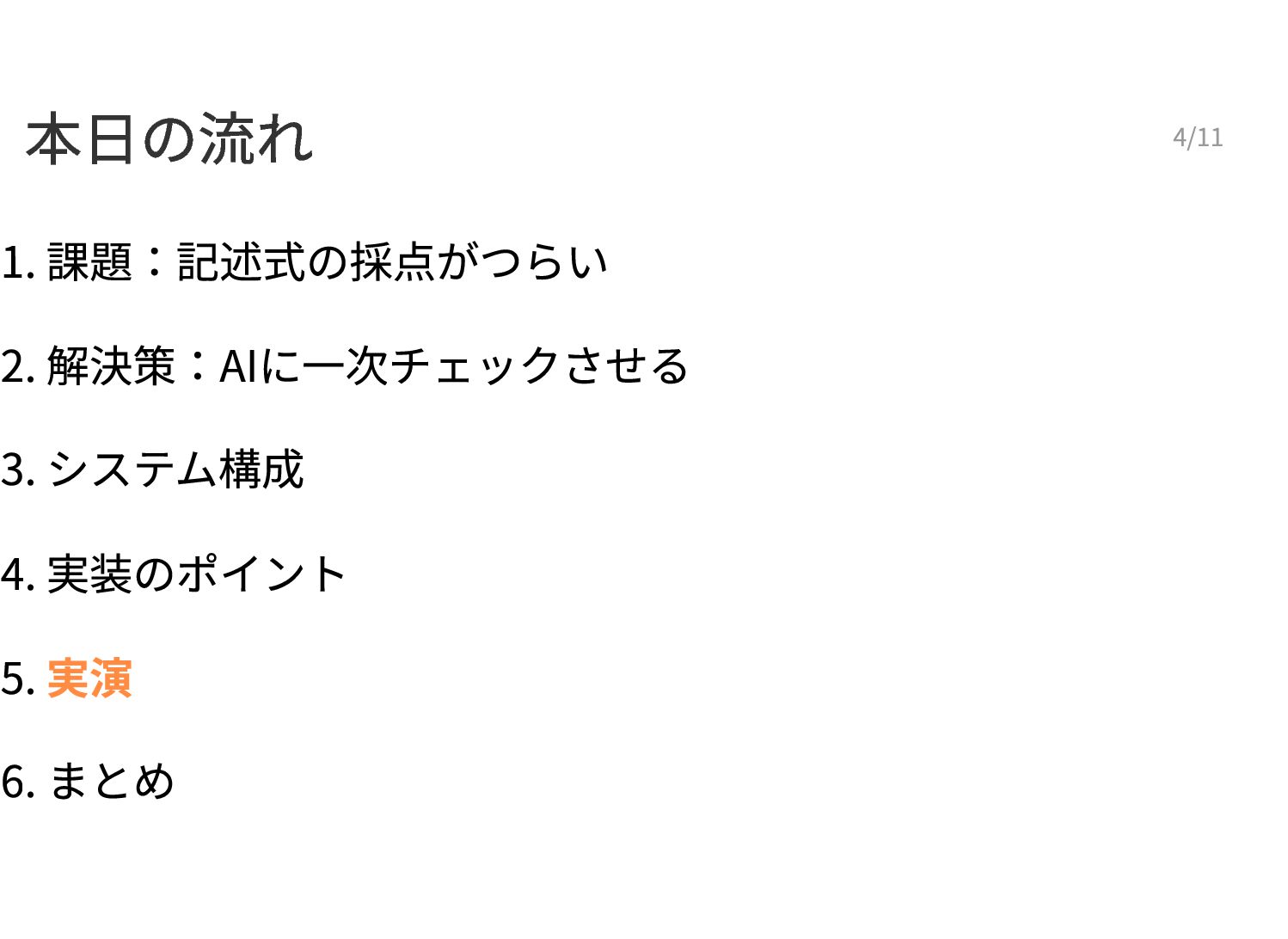 本日の流れ 1. 課題:記述式の採点がつらい 2. 解決策:AIに一次チェックさせる 3. システム構成 4. 実装のポイント 5.
