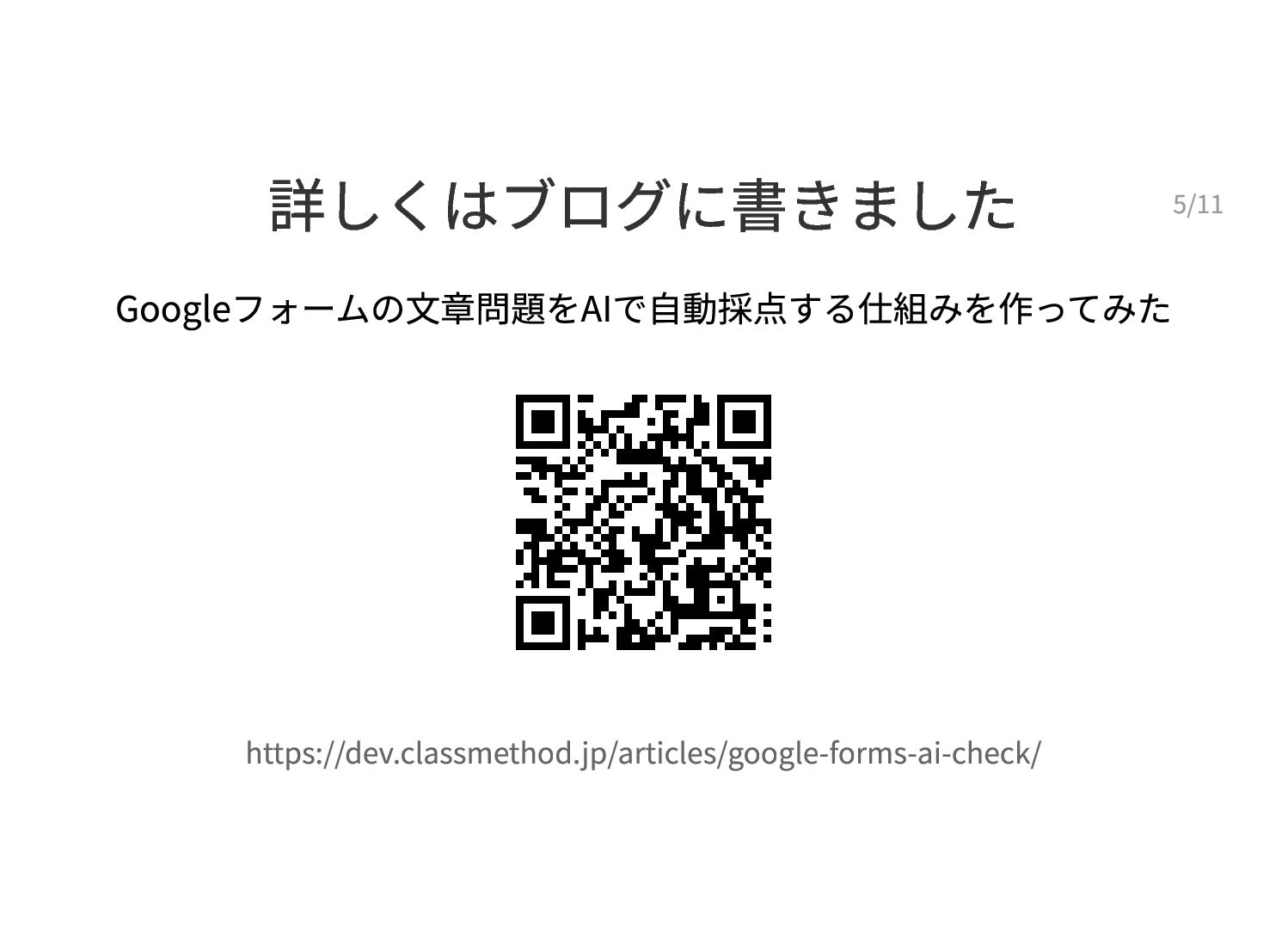 詳しくはブログに書きました Googleフォームの文章問題をAIで自動採点する仕組みを作ってみた https://dev.classmethod.jp/articles/google-forms-ai-check/ 5/11
