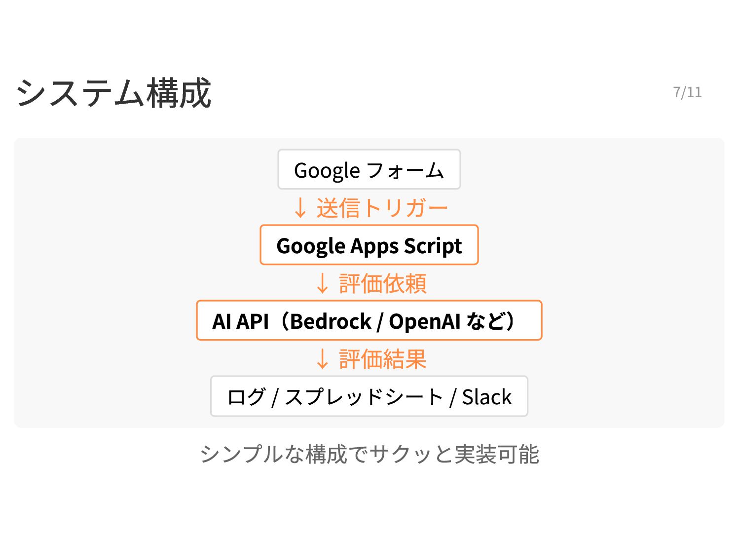 システム構成 Google フォーム ↓ 送信トリガー Google Apps Script ↓ 評価依頼