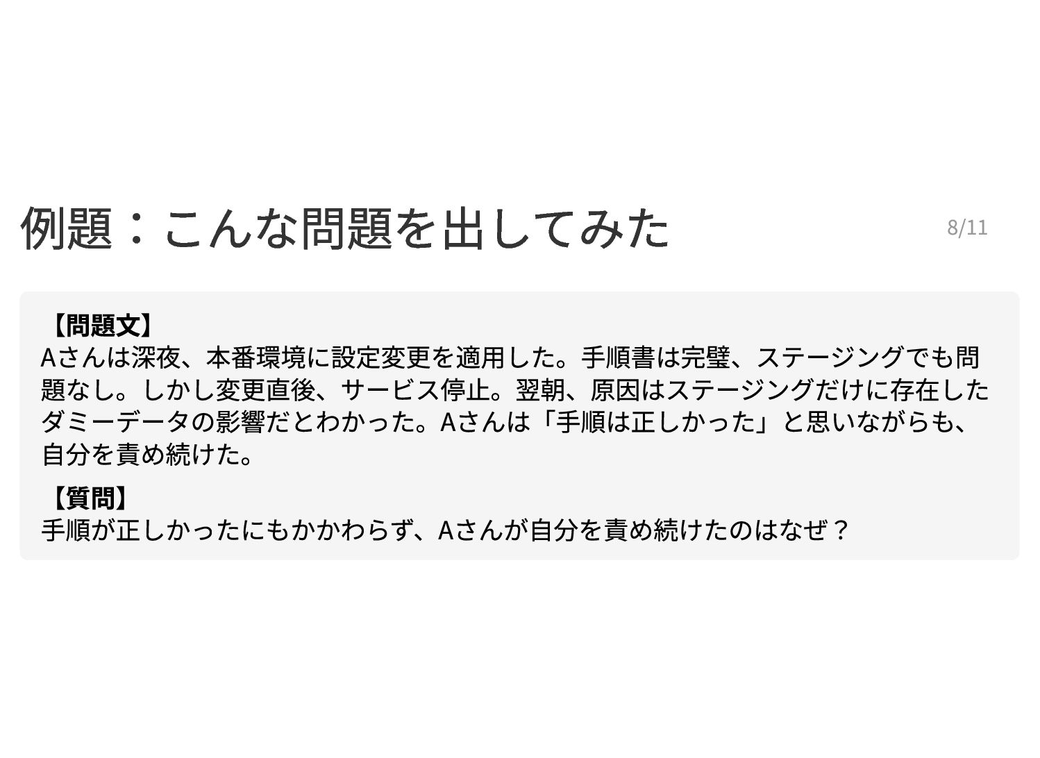例題:こんな問題を出してみた 【問題文】 Aさんは深夜、本番環境に設定変更を適用した。手順書は完璧、ステージングでも問 題なし。しかし変更直後、サービス停止。翌朝、原因はステージングだけに存在した ダミーデータの影響だとわかった。Aさんは「手順は正しかった」と思いながらも、 自分を責め続けた。 【質問】 手順が正しかったにもかかわらず、Aさんが自分を責め続けたのはなぜ? 8/11