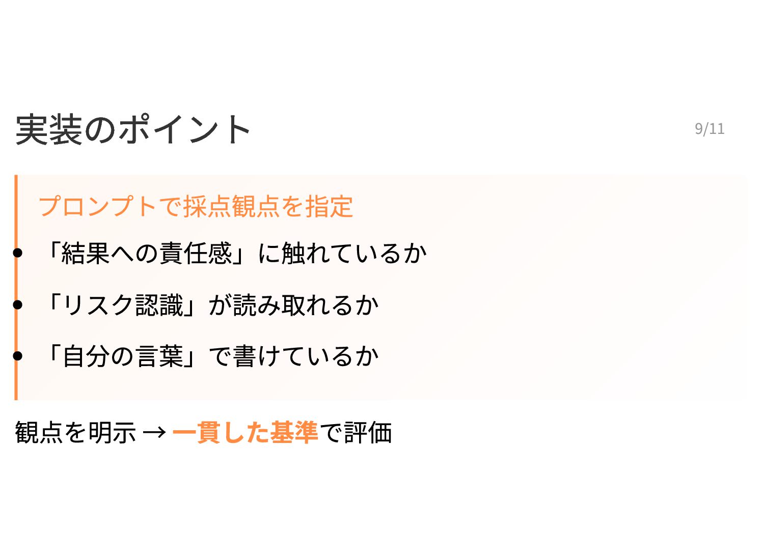 実装のポイント プロンプトで採点観点を指定 「結果への責任感」に触れているか 「リスク認識」が読み取れるか 「自分の言葉」で書けているか 観点を明示 → 一貫した基準で評価 9/11