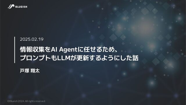 情報収集をAI Agentに任せるため、 プロンプトもLLMが更新するようにした話 戸塚 翔太 2025.02.19 ©Blueish 2024. All rights