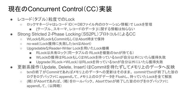}に関する情報は知らない • Strong Stricted 2-Phase Locking(SS2PL)プロトコルによるCC ◦ WLockもRLockもCommitもしくはAbort時まで保持 ◦ no-wait(Lock獲得に失敗したtxnはAbort) ◦ UpgradableなReader-Writer Lockを用いたLock機構 ▪ RLockは共有ロック(同一タプルの RLockを複数のtxnが持てる) ▪ WLockの獲得はRLockもしくはWLockを持っているtxnが自分以外にいたら獲得失敗 ▪ Upgrade(RLock->WLock)はRLockを持っているtxnが自分以外にいたら獲得失敗 • 更新系操作(Update, Delete, Insert)はCommitを待たずしてメモリ上のデータへ反映 ◦ txnの終了がCommitであればメモリ上のデータへの更新はそのまま。 commitでtxnが終了した旨の ログをログバッファに appendして、メモリ上のログデータを Flushし、持っていたLockを全て解放 ◦ (略)がAbortであれば、(略)をロールバック。 Abortでtxnが終了した旨のログをログバッファに appendして、(以降略)