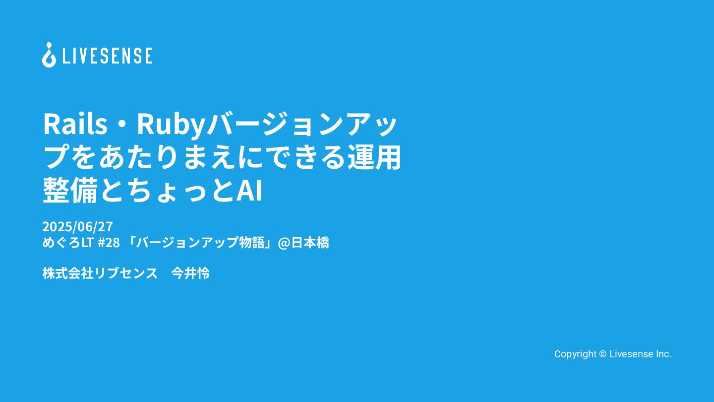 Rails‧Rubyバージョンアッ プをあたりまえにできる運⽤ 整備とちょっとAI 2025/06/27 めぐろLT #28 「バージョンアップ物語」@⽇本橋 株式会社リブセンス 今井怜 Copyright ©