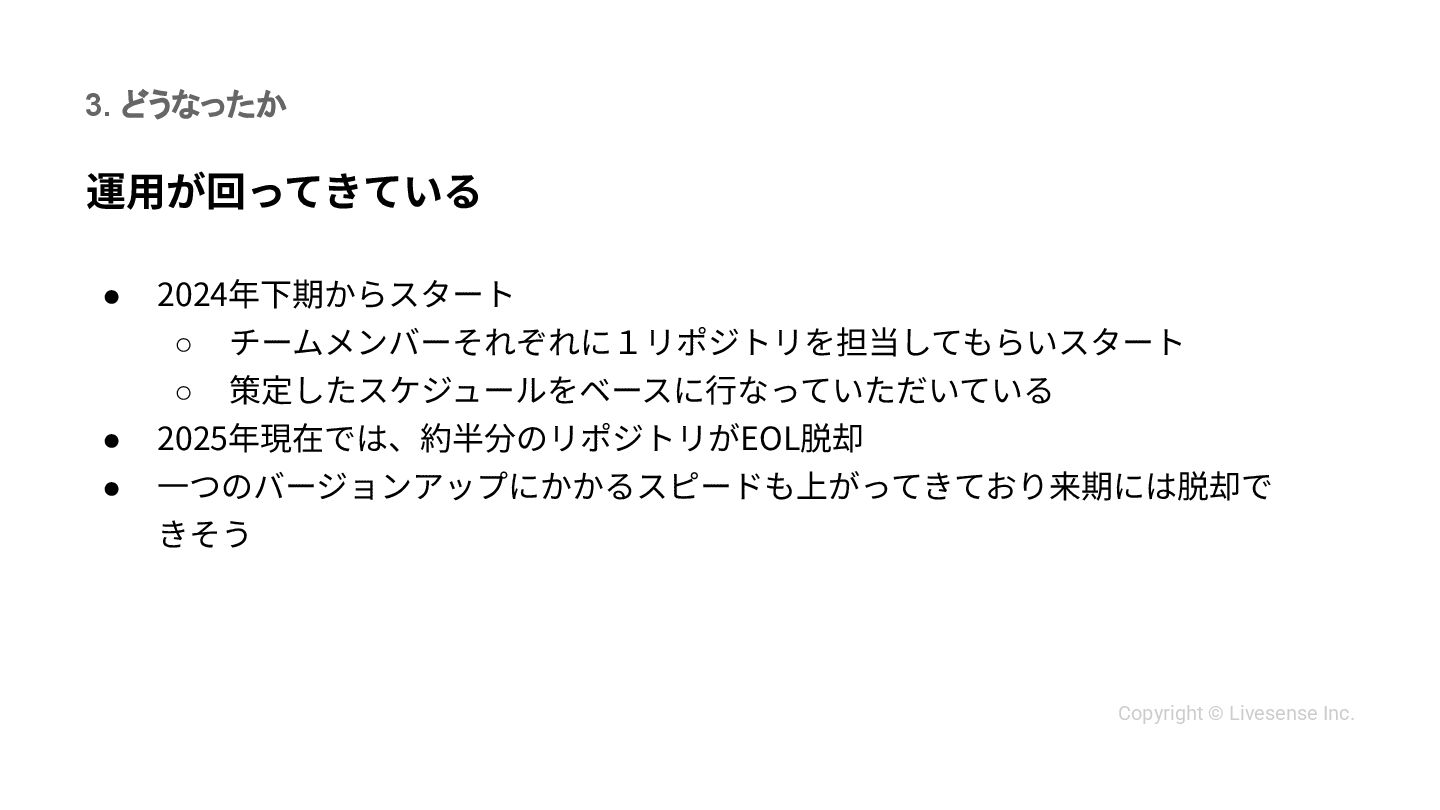 • 2024年下期からスタート ◦ チームメンバーそれぞれに1リポジトリを担当してもらいスタート ◦ 策定したスケジュールをベースに⾏なっていただいている • 2025年現在では、約半分のリポジトリがEOL脱却 • ⼀つのバージョンアップにかかるスピードも上がってきており来期には脱却で