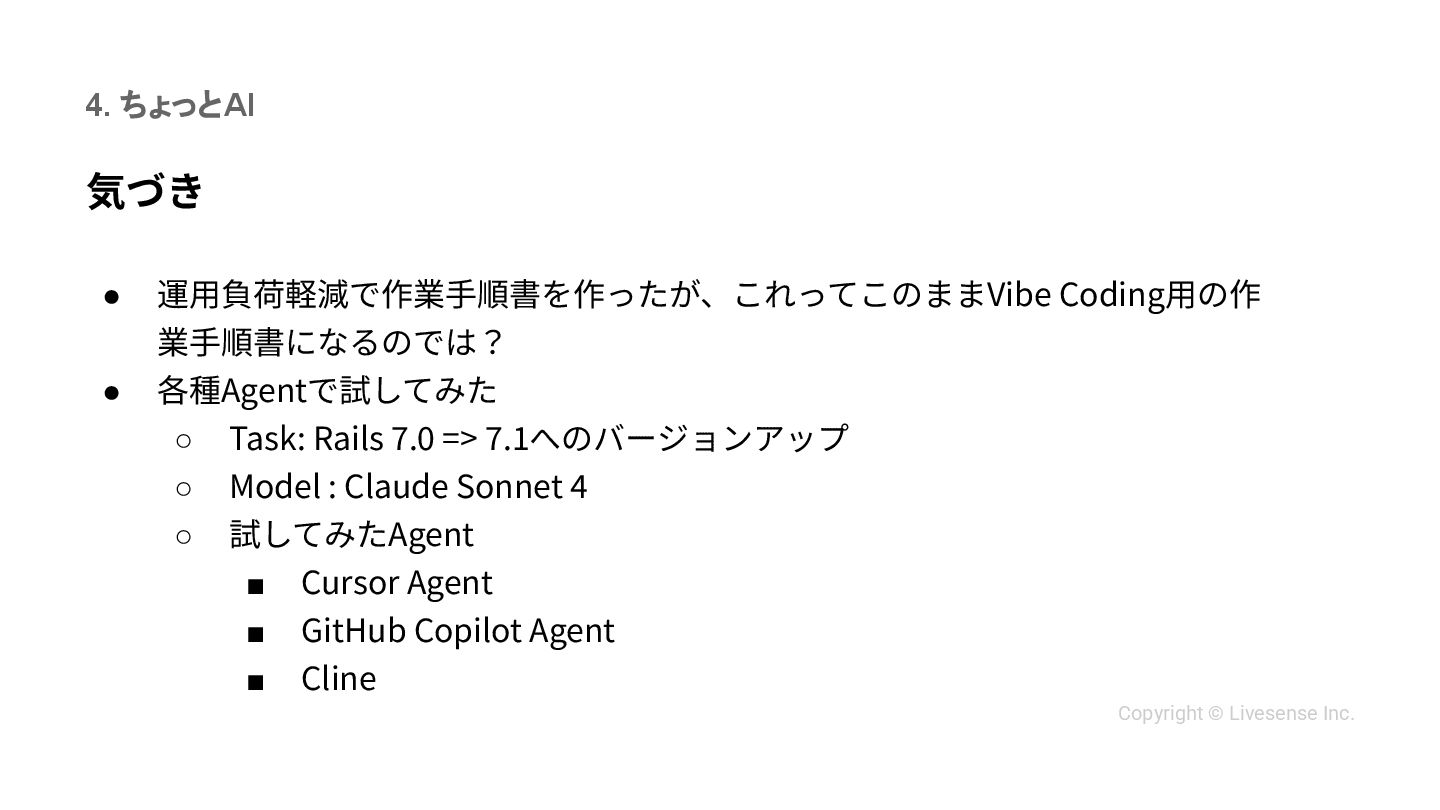 => 7.1へのバージョンアップ ◦ Model : Claude Sonnet 4 ◦ 試してみたAgent ▪ Cursor Agent ▪ GitHub Copilot Agent ▪ Cline 気づき 4. ちょっとAI Copyright © Livesense Inc.