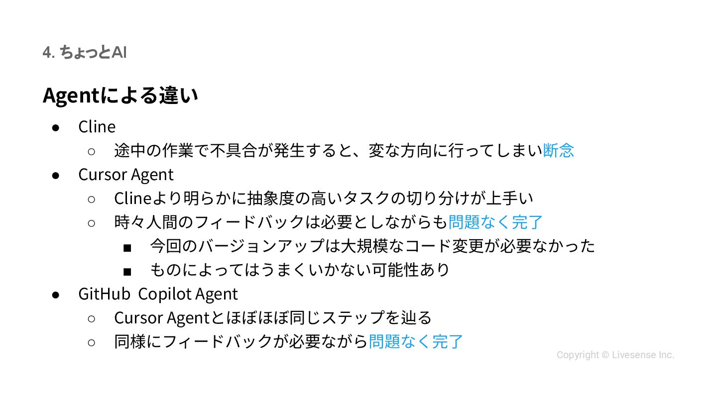 時々⼈間のフィードバックは必要としながらも問題なく完了 ▪ 今回のバージョンアップは⼤規模なコード変更が必要なかった ▪ ものによってはうまくいかない可能性あり • GitHub Copilot Agent ◦ Cursor Agentとほぼほぼ同じステップを辿る ◦ 同様にフィードバックが必要ながら問題なく完了 Agentによる違い 4. ちょっとAI Copyright © Livesense Inc.