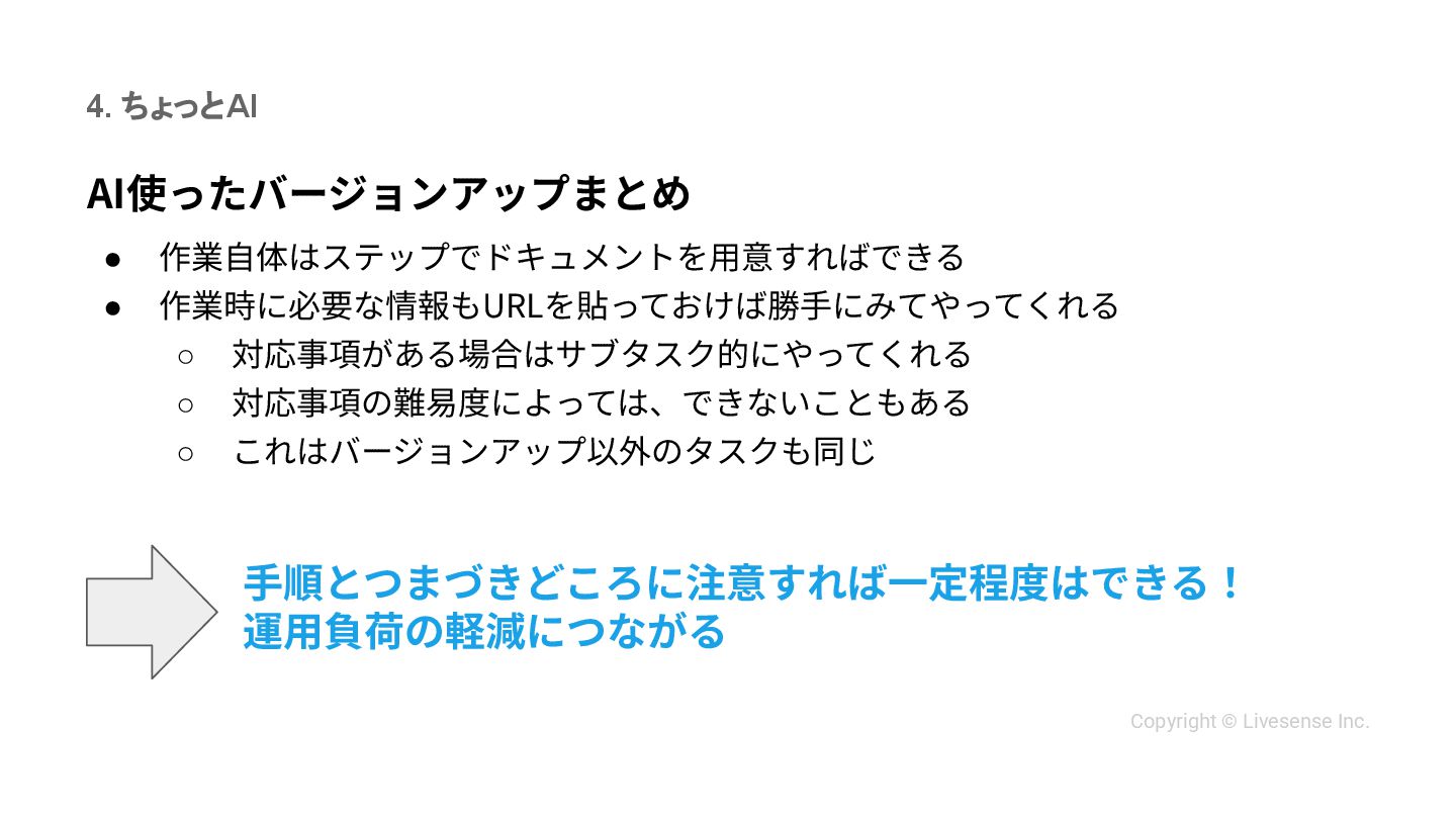 AI使ったバージョンアップまとめ 4. ちょっとAI Copyright © Livesense Inc. ⼿順とつまづきどころに注意すれば⼀定程度はできる! 運⽤負荷の軽減につながる