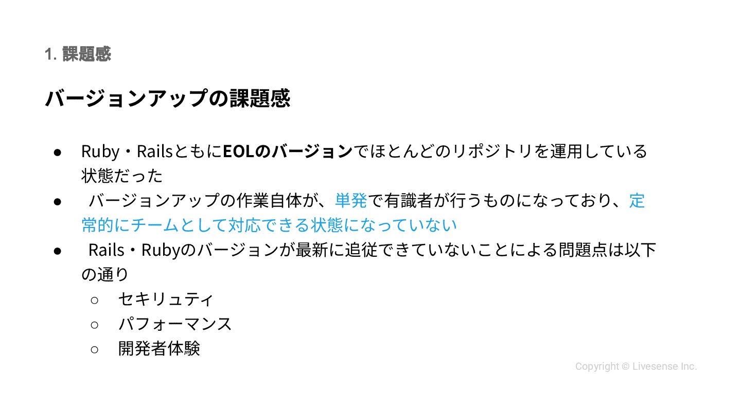 • Ruby‧RailsともにEOLのバージョンでほとんどのリポジトリを運⽤している 状態だった • バージョンアップの作業⾃体が、単発で有識者が⾏うものになっており、定 常的にチームとして対応できる状態になっていない • Rails‧Rubyのバージョンが最新に追従できていないことによる問題点は以下 の通り ◦