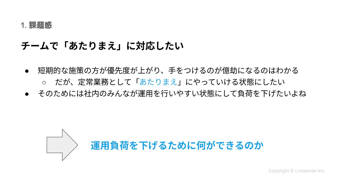 • 短期的な施策の⽅が優先度が上がり、⼿をつけるのが億劫になるのはわかる ◦ だが、定常業務として「あたりまえ」にやっていける状態にしたい • そのためには社内のみんなが運⽤を⾏いやすい状態にして負荷を下げたいよね チームで「あたりまえ」に対応したい 1. 課題感 Copyright