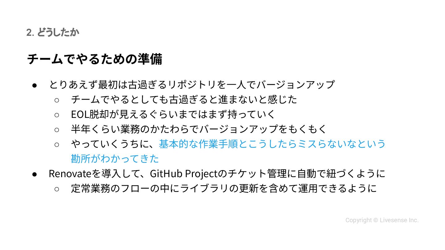 勘所がわかってきた • Renovateを導⼊して、GitHub Projectのチケット管理に⾃動で紐づくように ◦ 定常業務のフローの中にライブラリの更新を含めて運⽤できるように チームでやるための準備 2. どうしたか Copyright © Livesense Inc.