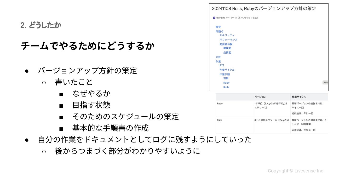 • バージョンアップ⽅針の策定 ◦ 書いたこと ▪ なぜやるか ▪ ⽬指す状態 ▪ そのためのスケジュールの策定