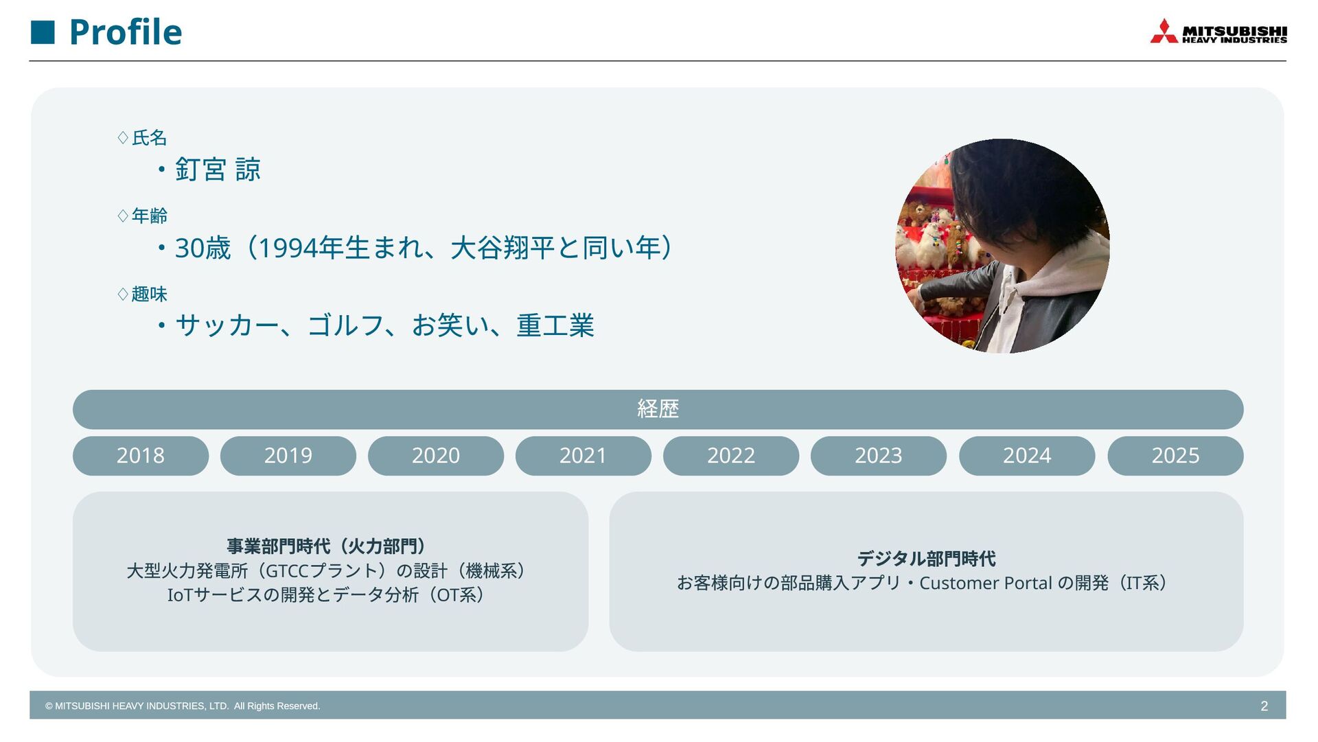 ・30 歳​ (1994 年生まれ、​ 大谷翔平と​ 同い​ 年)​ ・サッカー、​ ゴルフ、​ お笑い、​ 重工業 経歴 2018 2019 2020 2021 2022 2023 2025 2024 事業部​ 門時代​ (火力部​ 門)​ 大型火力発電所​ (GTCC プラント)の​ 設計​ (機械系)​ IoT サービスの​ 開発と​ データ分析​ (OT 系)​ デジタル部​ 門時代 お客様向けの​ 部​ 品購入アプリ・Customer Portal の​ 開発​ (IT 系)​