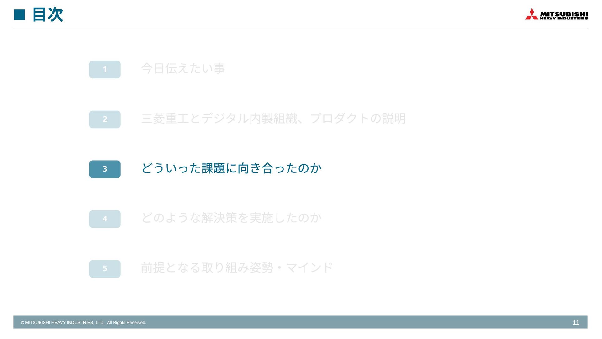11. 1 2 3 4 今日​ 伝えたい​ 事 三菱重工と​ デジタル内製組織、​ プロダクトの​