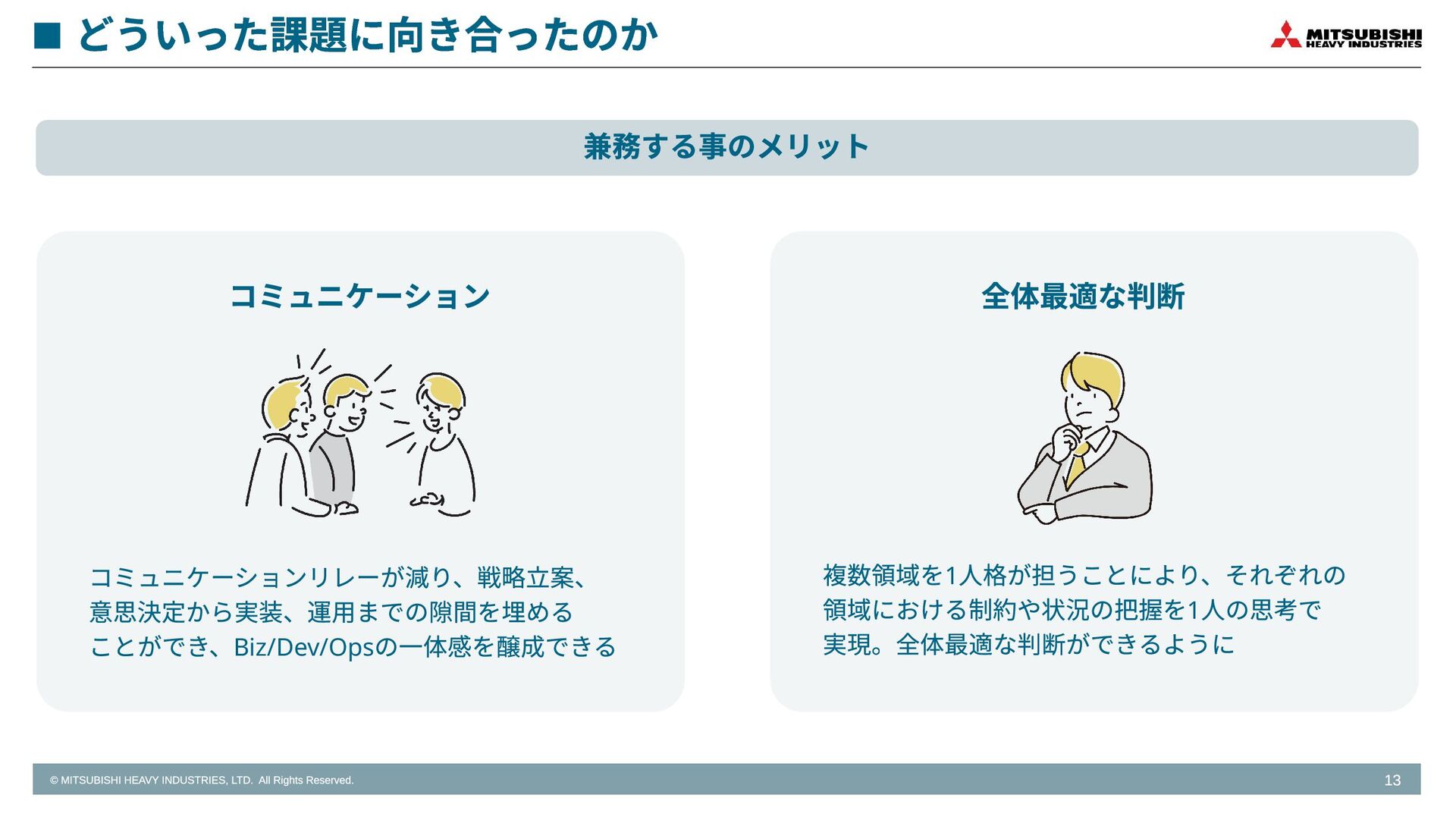 埋める​ ことができ、​ Biz/Dev/Ops の​ 一体​ 感を​ 醸成できる​ コミュニケーション 全体最適な判断 複数領域を​ 1 人格が​ 担うことに​ より、​ それぞれの​ 領域に​ おける​ 制約や​ 状況の​ 把握を​ 1 人の​ 思考で​ 実現。​ 全体​ 最適な​ 判断が​ できるように​ どういった課題に向き合ったのか